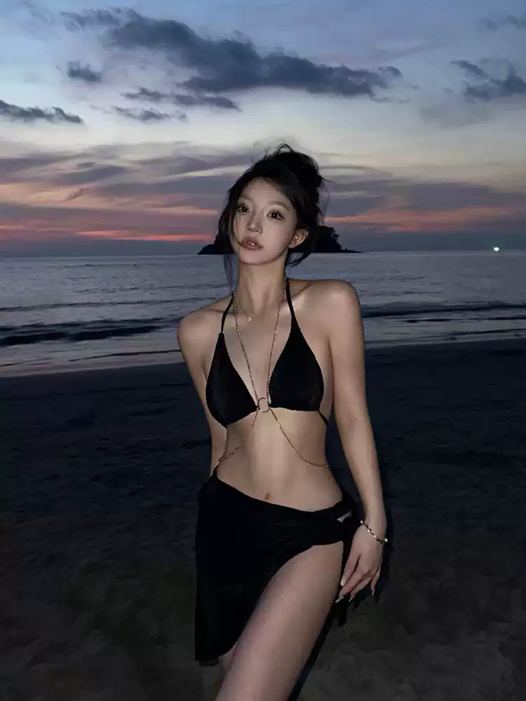 Trendy Fashionable Influencer Style Black Chain Separate Three-Piece Bikini Swimsuit for Women