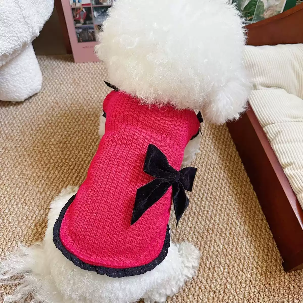 Dog Clothes Autumn & Winter New Style Bowknot Puff Coat Thickened Sweater for Bichon Frise & Teddy (New Year Ceremony Outfit)