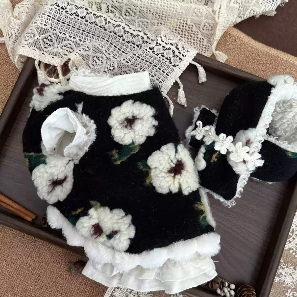 Korean-Inspired Winter Warm Floral Fleece-Lined Dog Vest Cardigan Sweater