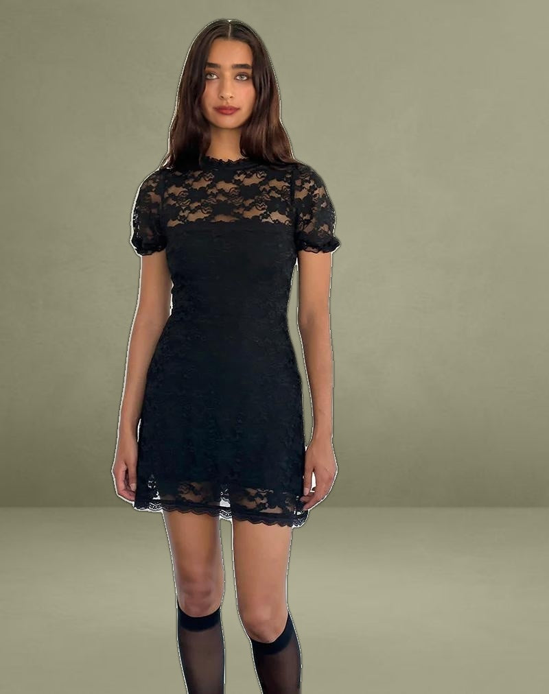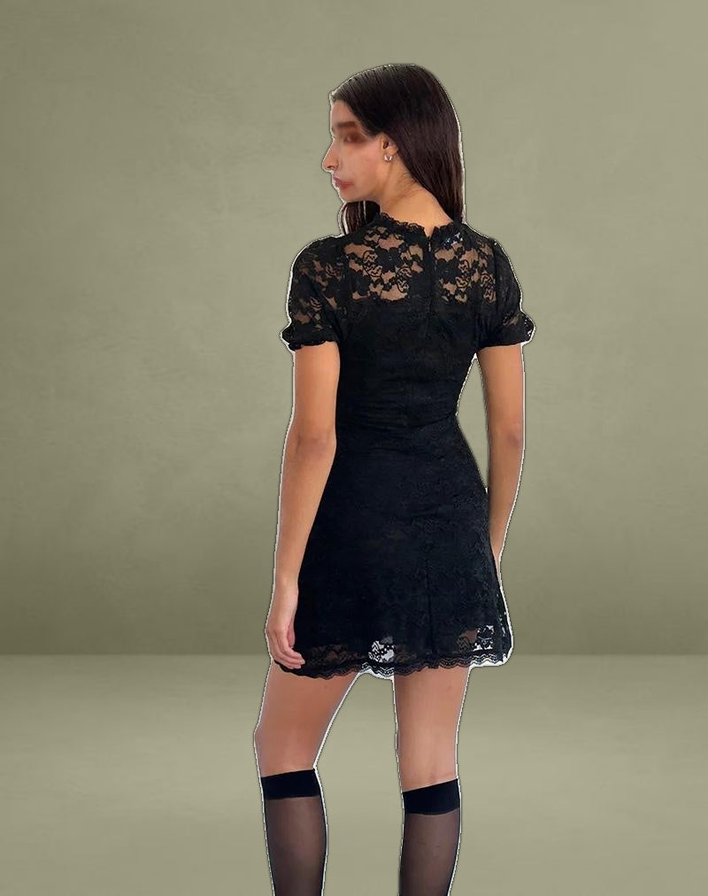 The Adele dress features short sleeves and high neckline with frill detail, bodycon fit in black jasmine lace with scalloped hem in a mini length.