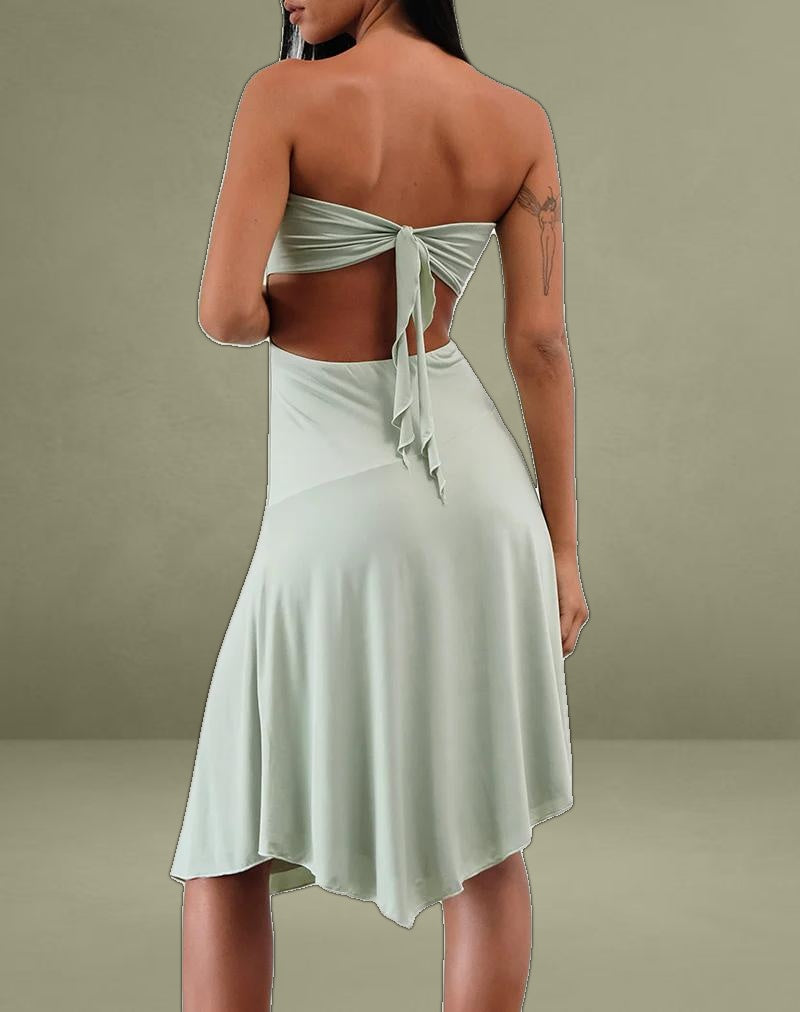 Bandeau midi dress with a self tie open back and asymmetric dropped waistline with a floaty hem. Comes in a sage green super soft slinky fabric.