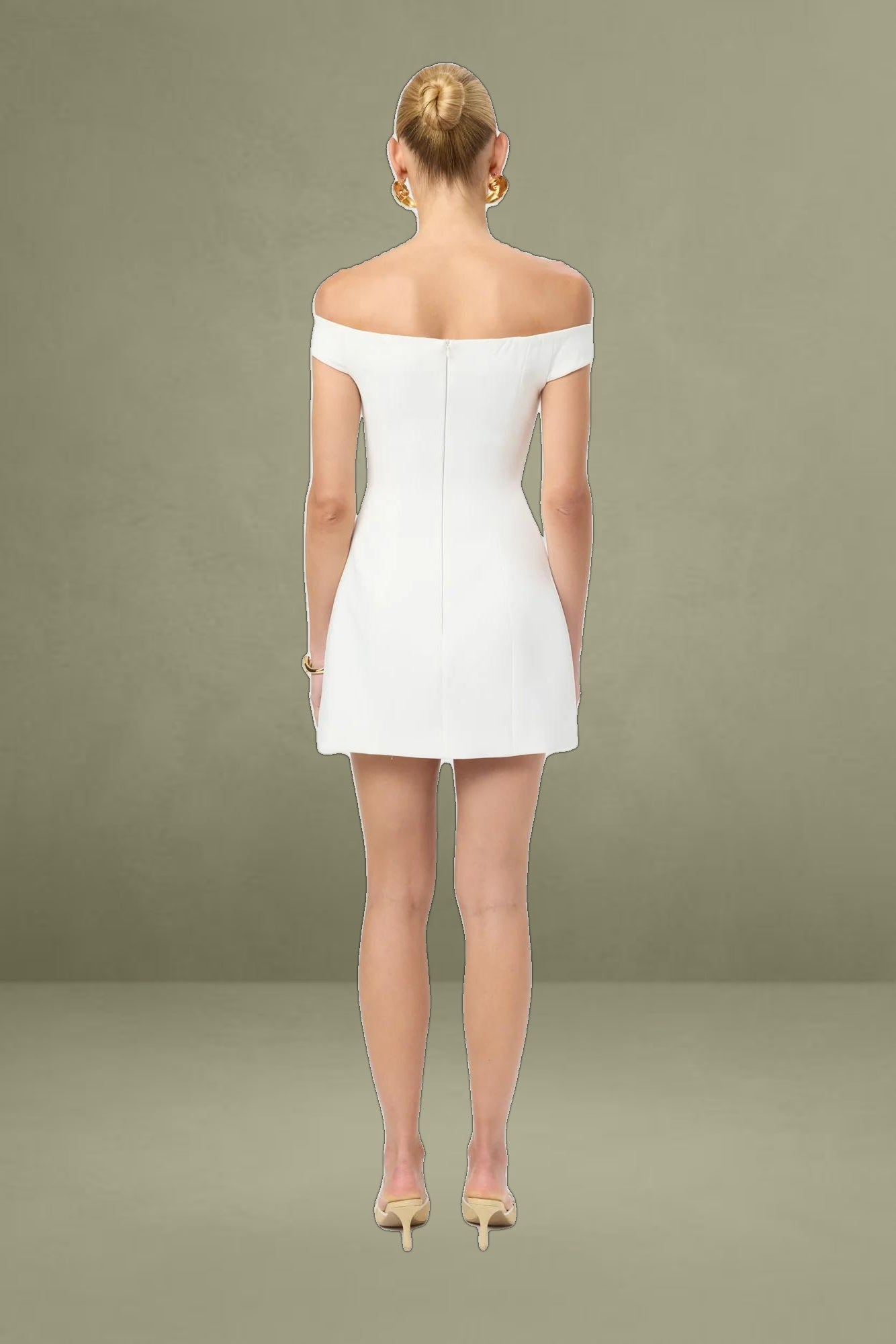 The Alto Off-Shoulder Dress is a modern take on classic elegance. This soft white mini dress features a structured fit-and-flare silhouette, crafted from the luxurious Alto fabrication. The off-shoulder neckline adds a touch of femininity and sophistication. Pair it with a pointed heel for a chic cocktail look.