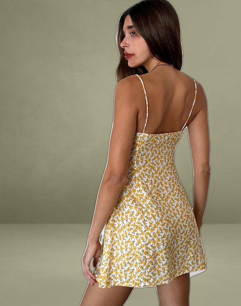 The Alvary dress features in a mini length with scoop neckline, thin spaghetti straps, a fitted waist and loose a-line flowy hem in a lightweight viscose fabric with a yellow floral print.