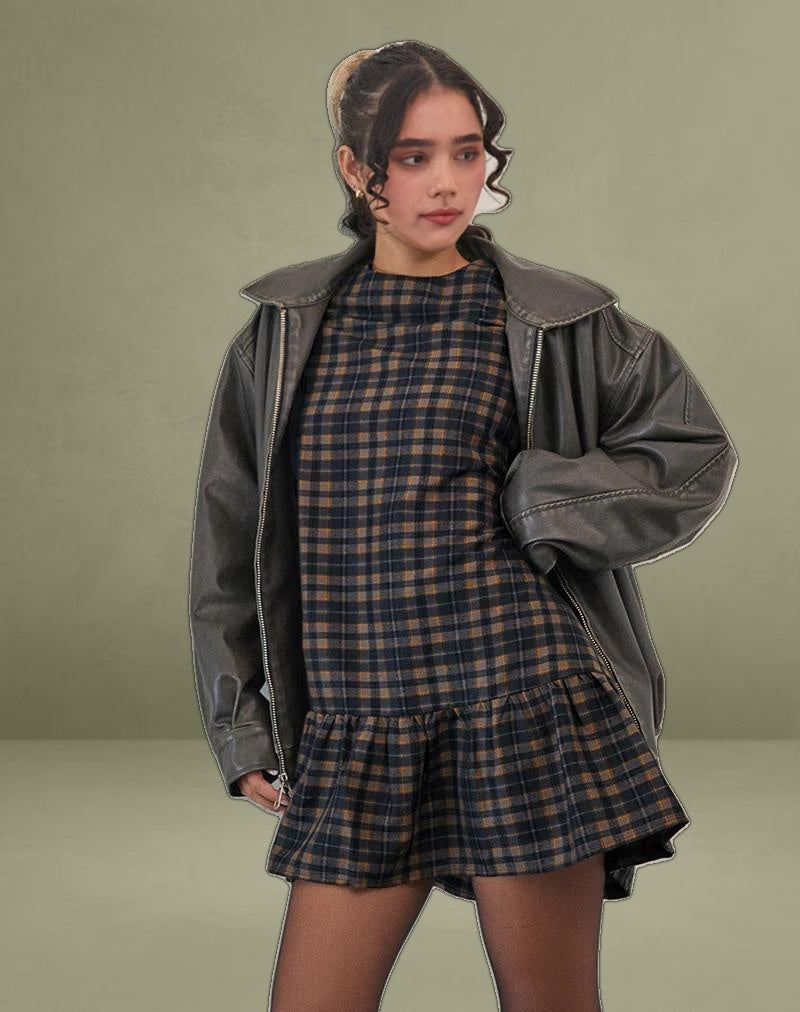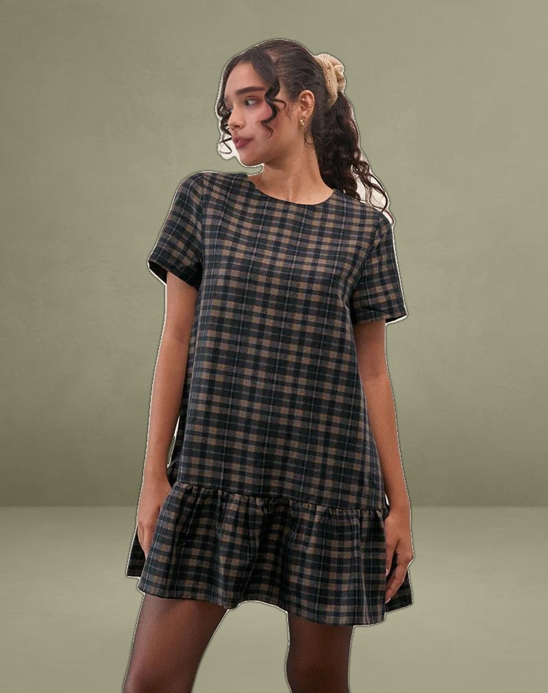 The Asterin smock dress features a mini length fit with drop waist loose pleat hem, crew neckline and short sleeves. In a navy mustard check soft tailoring fabric. Complete the look with our Cavita jacket.