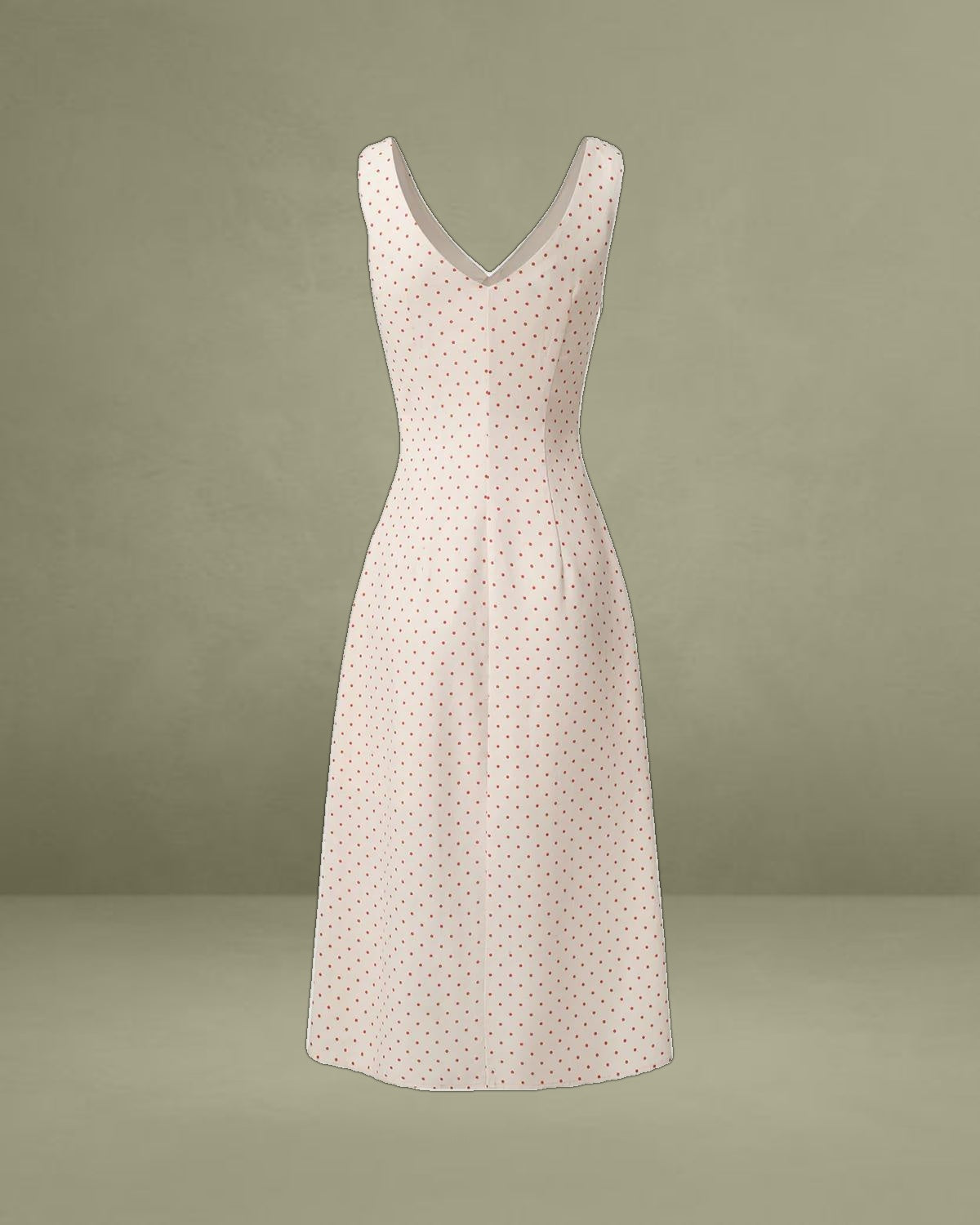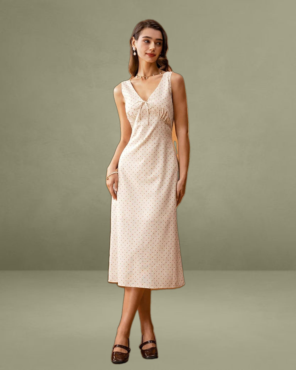 Featuring a flattering V neckline and elegant ruched detailing, this sleeveless midi dress enhances the silhouette while offering a chic, streamlined look. The neutral beige tone makes it easy to dress up or down, perfect for everything from daytime events to evening gatherings.