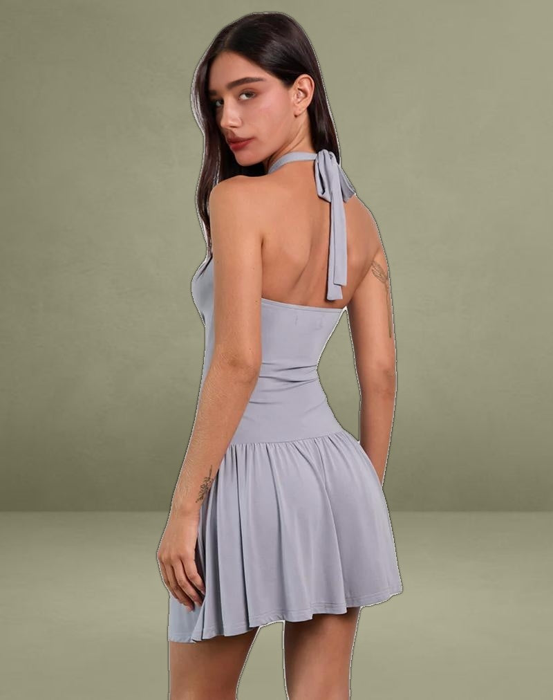 The Belasar mini dress in a cupro lilac grey fabric. Boasting a halterneck design detailed with a metal embellishment. Complete in bodycon style, it features a centre panel with ruching on either side. Detailed with a flowy hem.