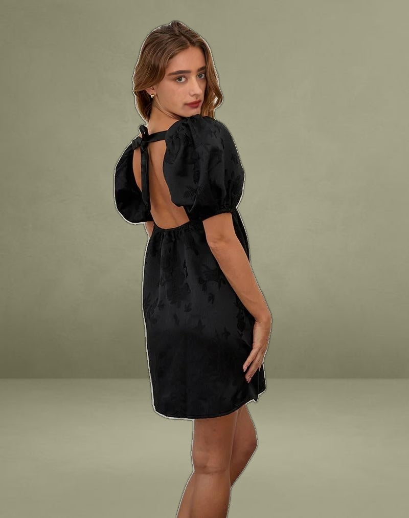 The Bimbi mini dress in black satin jacquard features a pull-on design with no fastening required. It showcases a functional back bow tie, creating an open back. The dress includes under bust seam detailing, a ruched skirt, a square neckline, and elasticated puff sleeves.
