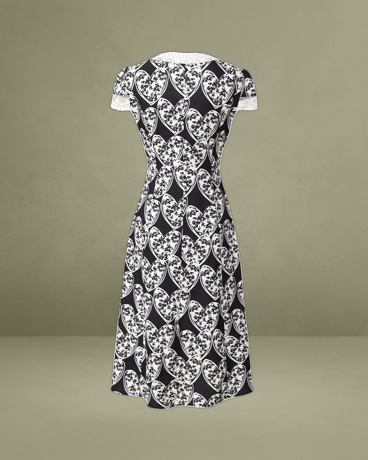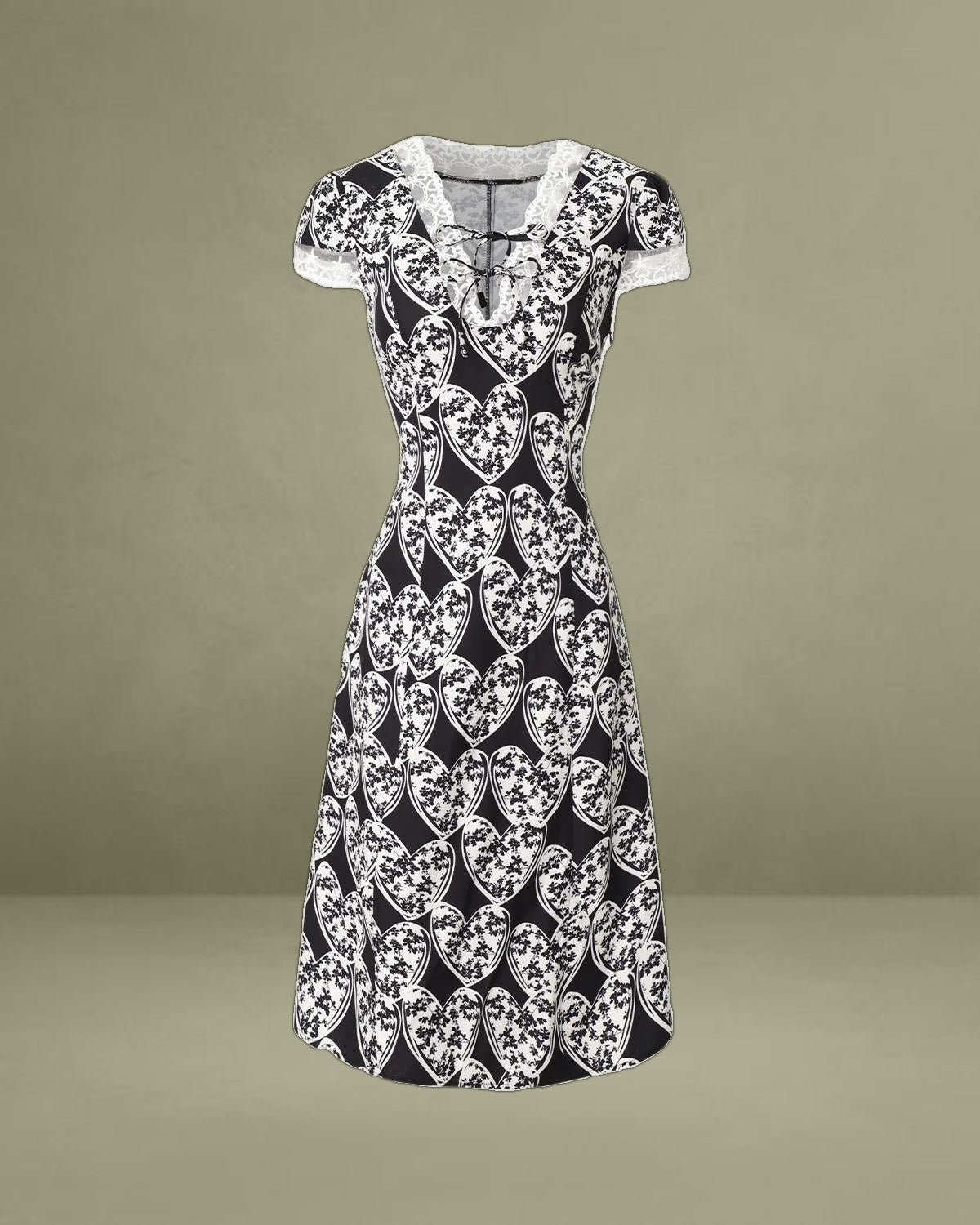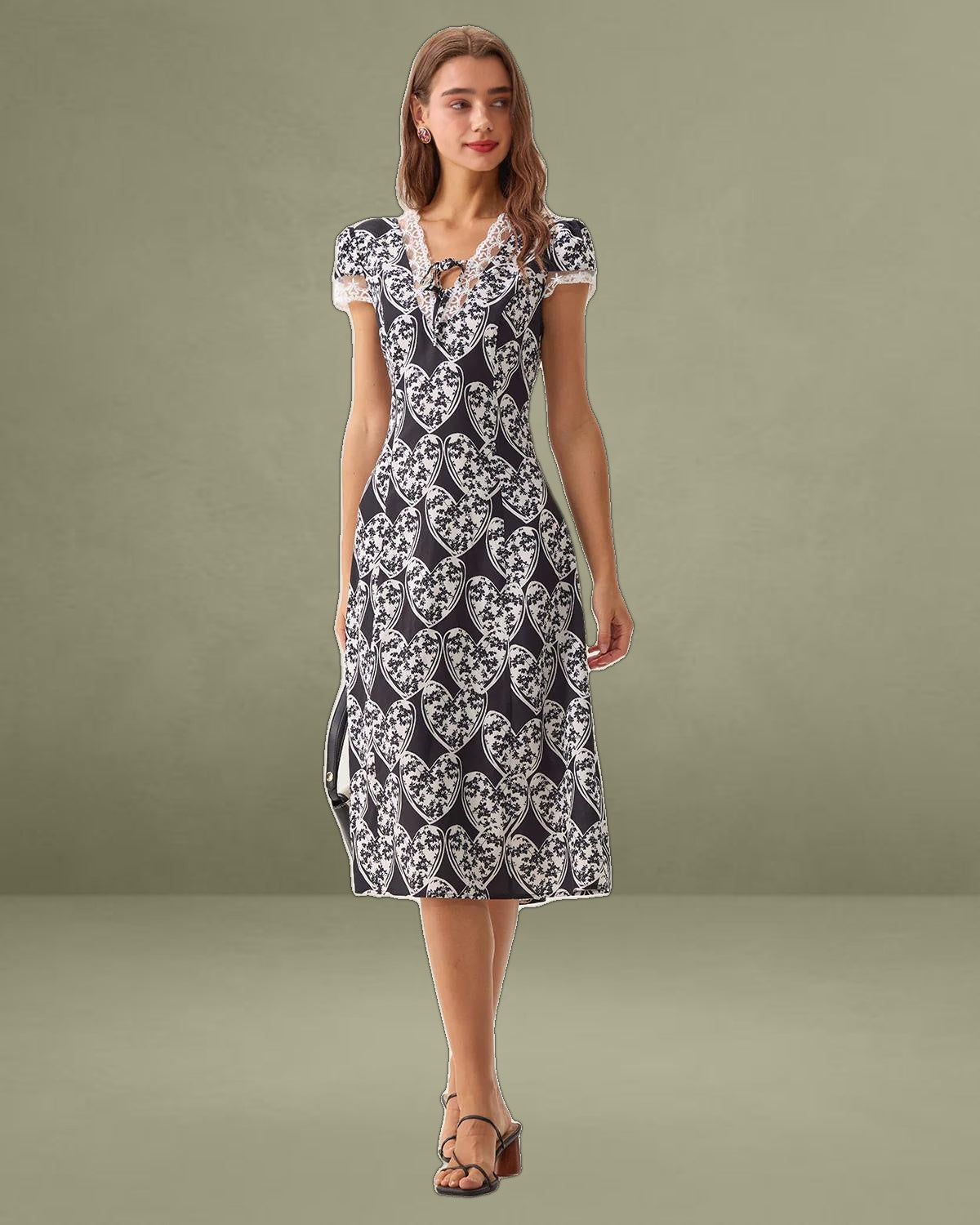 Adorned with a delicate floral print and finished with intricate lace trim, this dress combines femininity with a touch of drama. Its flattering midi length and soft, flowy silhouette make it ideal for dinner dates, evening events, or any occasion where you want to feel effortlessly chic and confident.