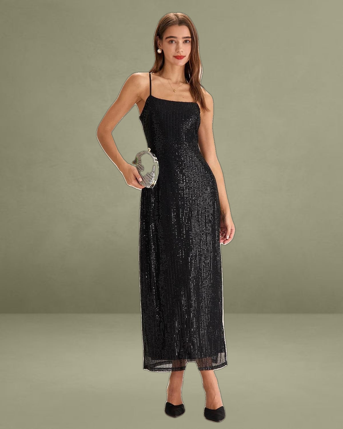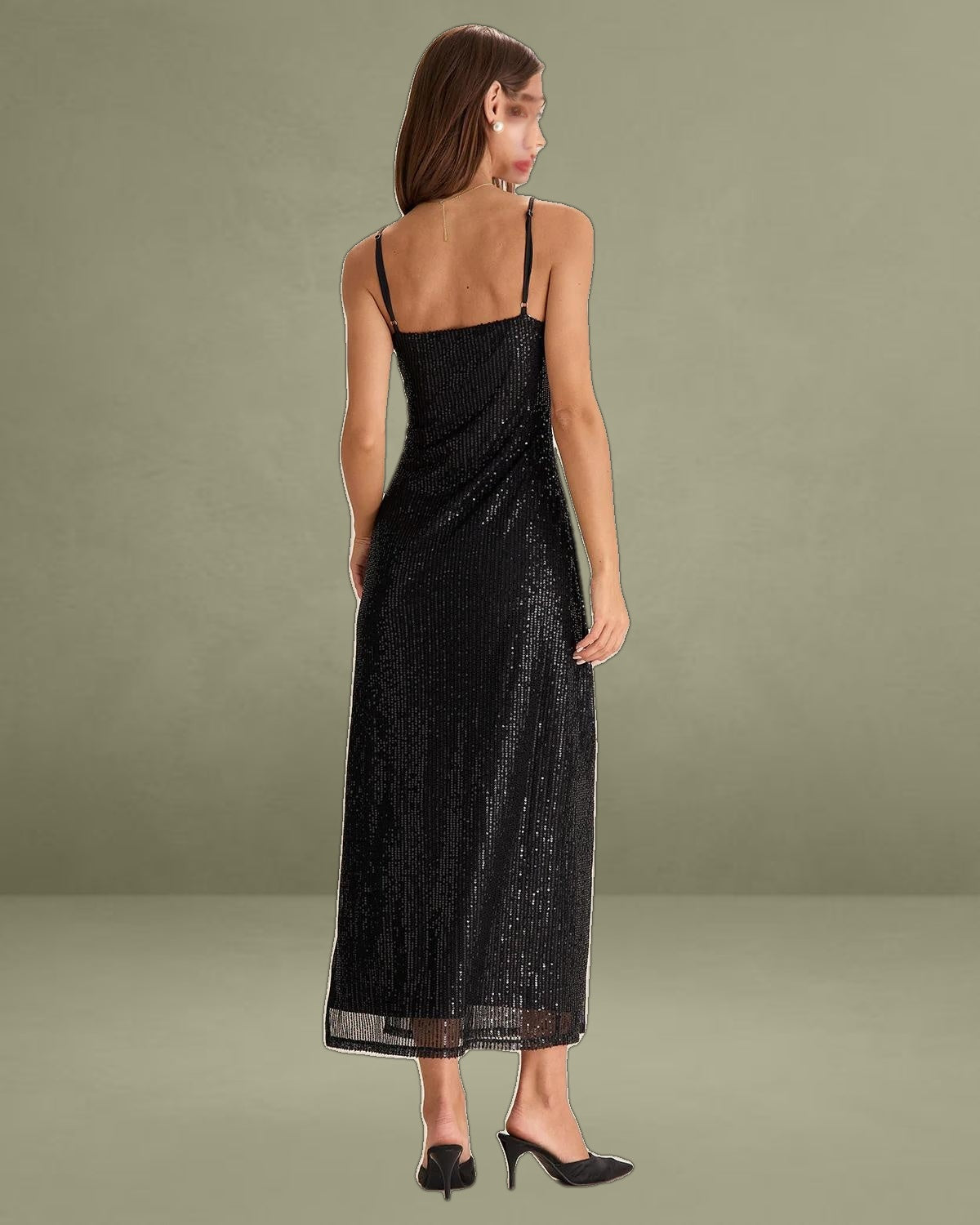 Covered in shimmering sequins, this dress catches the light beautifully, creating a dazzling effect as you move. The bodycon fit hugs your curves for a sleek silhouette, while the daring thigh-high slit adds an alluring touch. With a maxi length, it exudes elegance, making it ideal for formal events or special nights out.