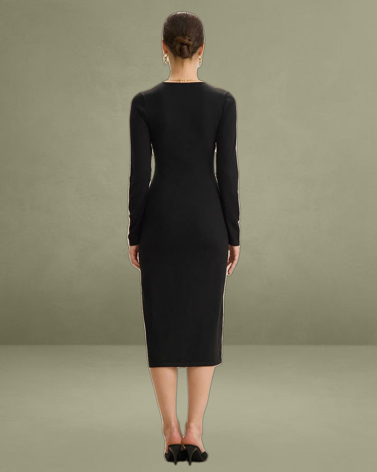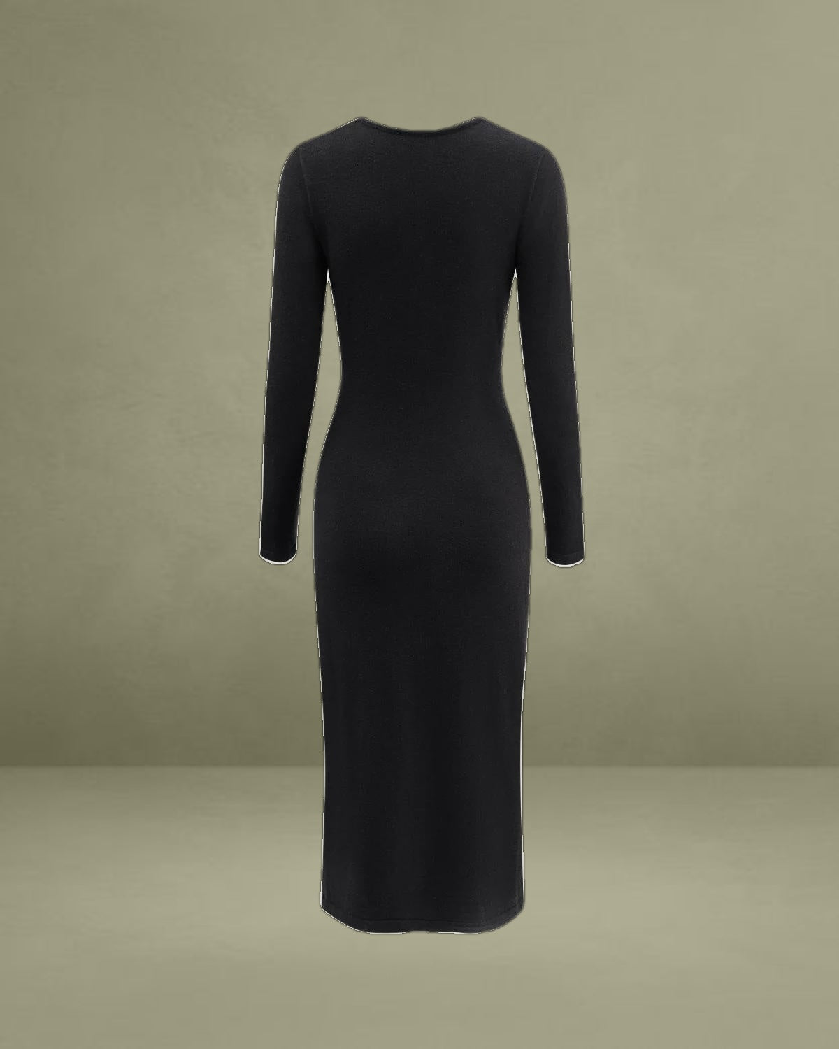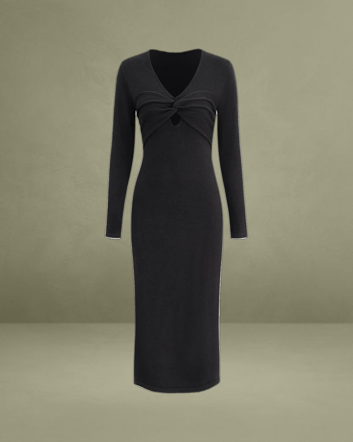 Made from soft, stretchy knit fabric, it offers both comfort and a figure-flattering fit. The long sleeves make it perfect for cooler seasons, while the cut-out design gives it a trendy, fashion-forward look. Ideal for nights out or special occasions, pair this dress with heels or boots for a striking and confident ensemble.
