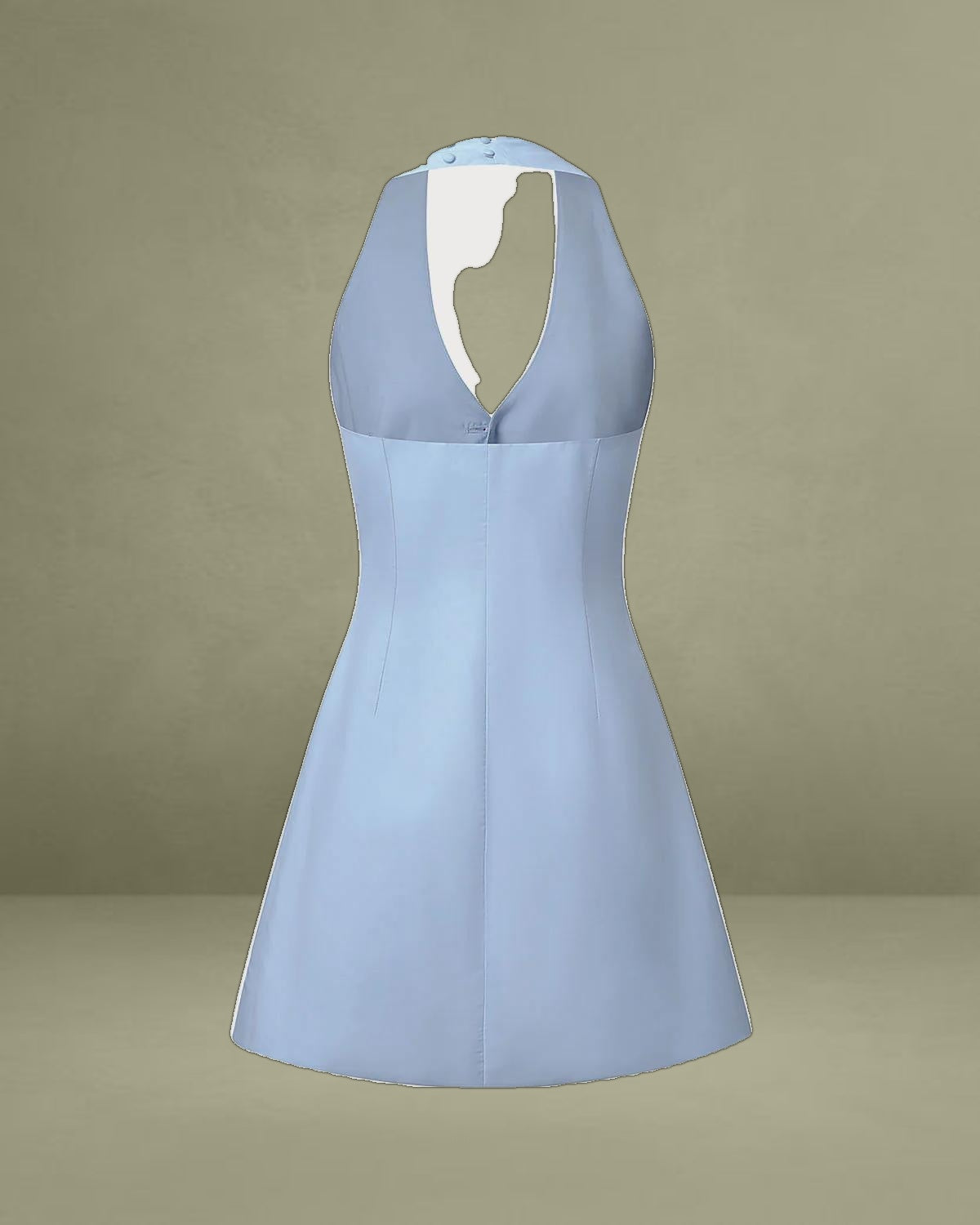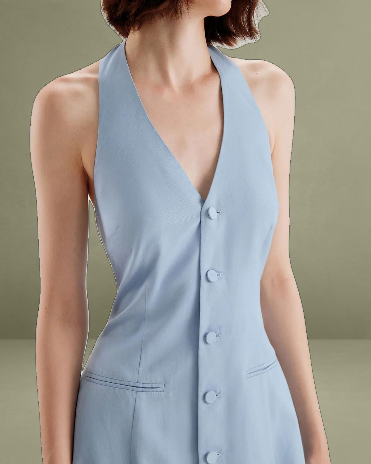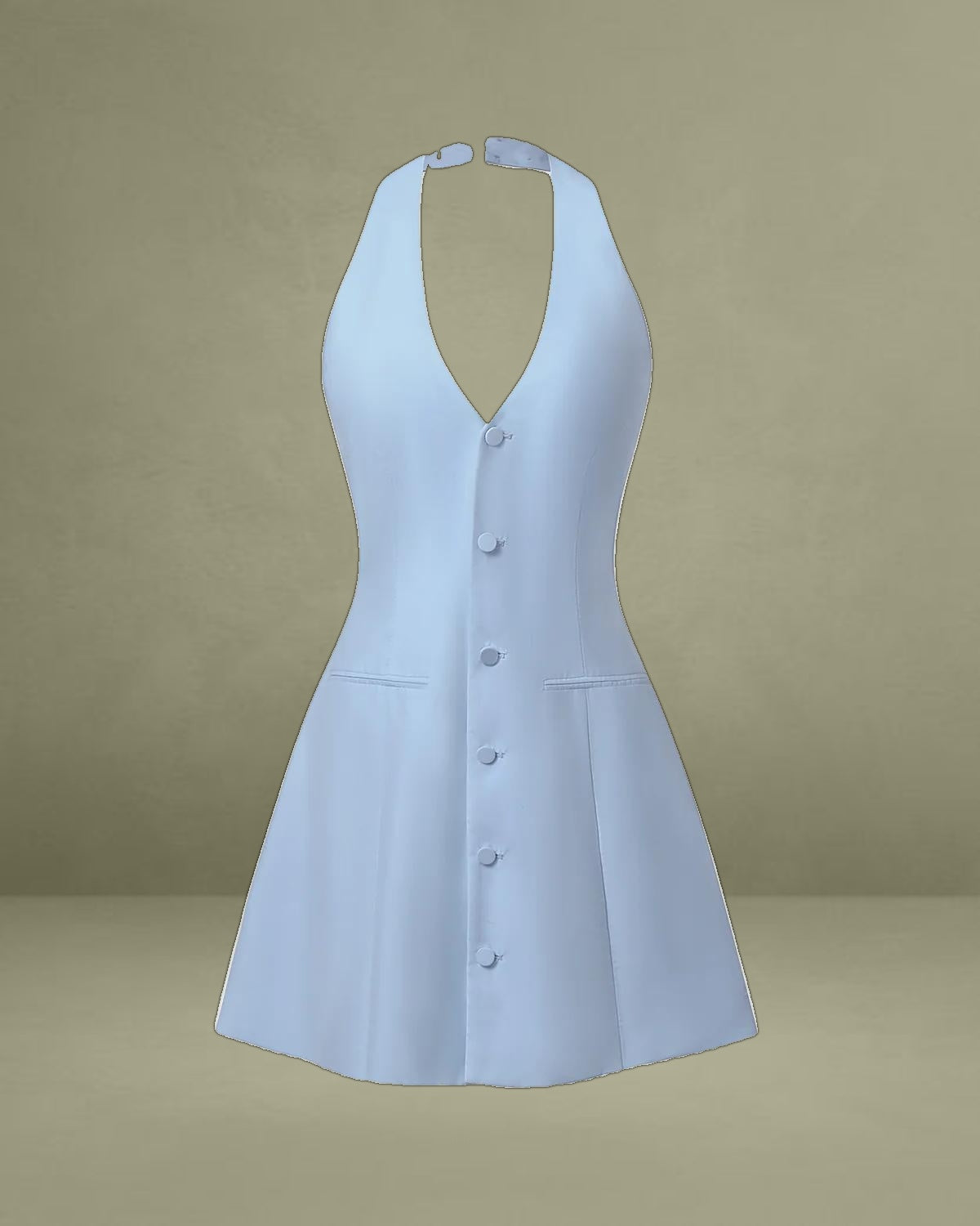 Crafted from lightweight and breathable fabric, this dress features a vibrant blue hue complemented by functional button accents down the front. The halter neckline adds a touch of elegance, while the practical pockets bring a relaxed vibe. Its mini length makes it ideal for warm weather, allowing you to showcase your personal style effortlessly.