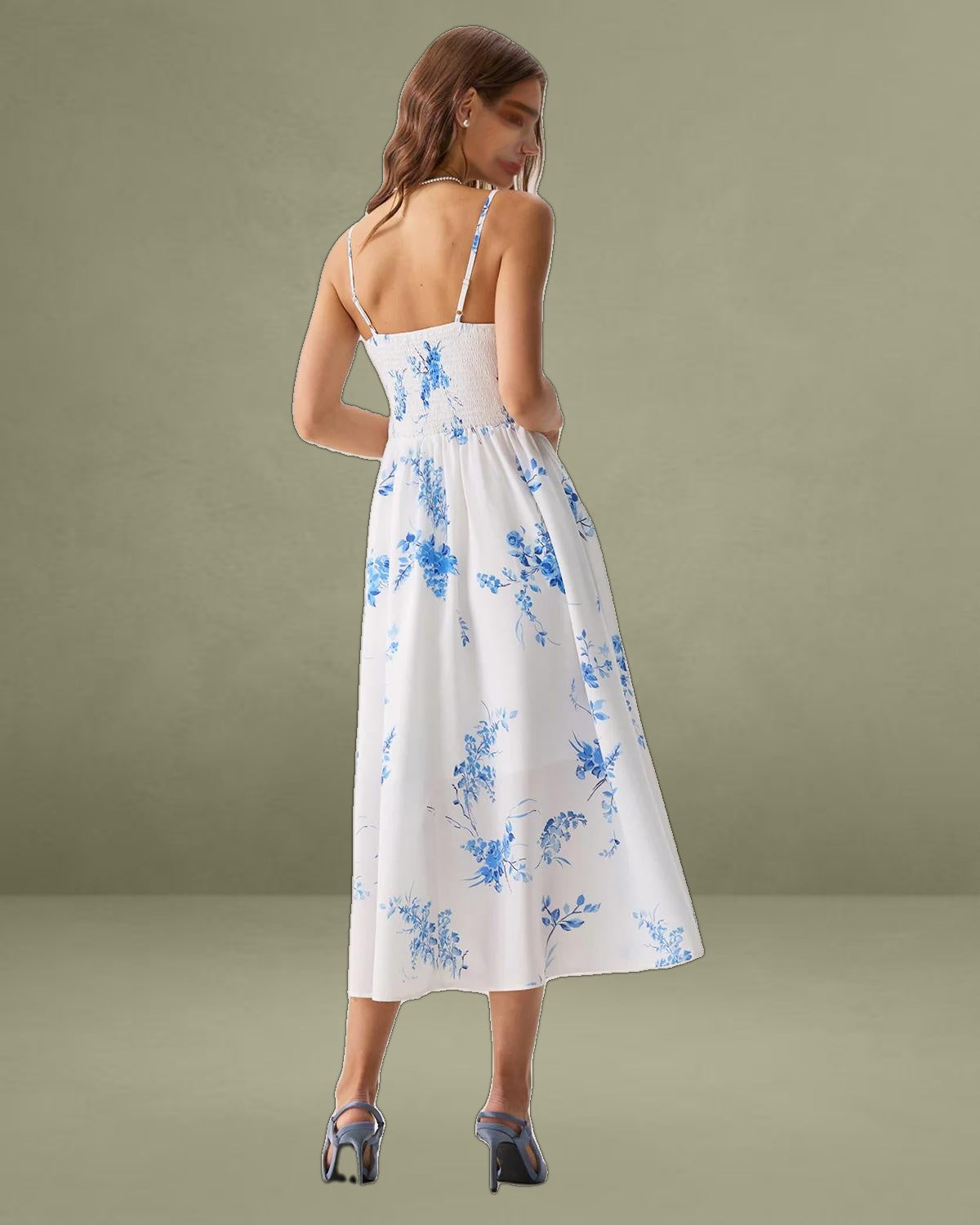 Featuring a romantic floral print in calming blue tones, this dress is designed with a shirred bodice for a flattering, flexible fit and slender adjustable straps for a delicate touch. The flowing maxi silhouette creates graceful movement, making it perfect for sunny days, beach getaways, or relaxed evening outings.