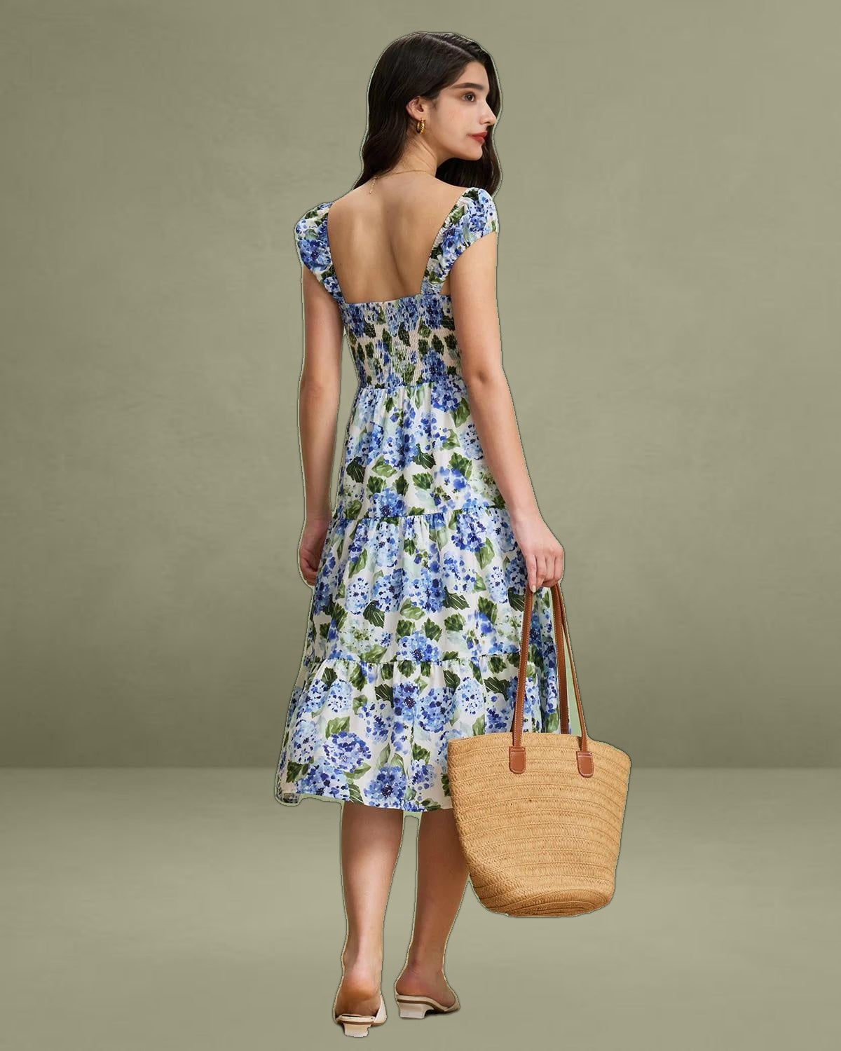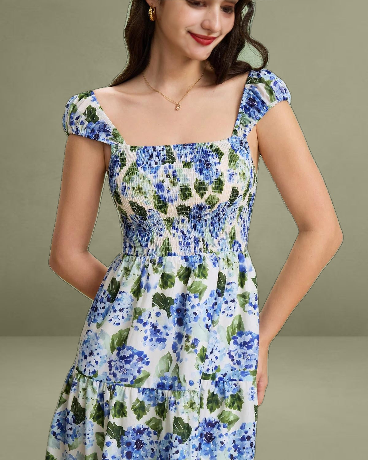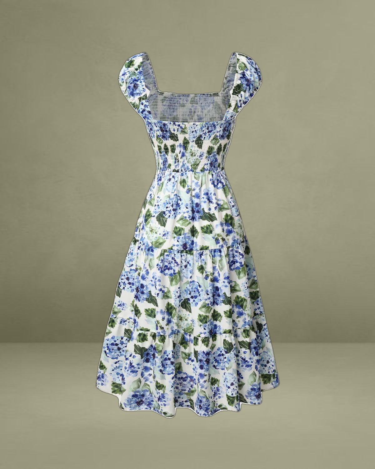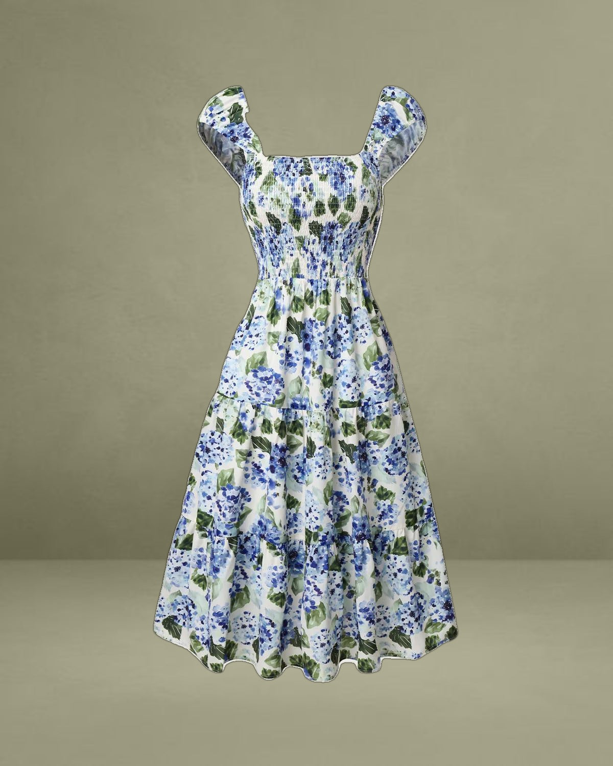 Featuring a flattering square neckline and a smocked (shirred) bodice, this midi dress offers both comfort and style with a beautifully contoured fit. The soft blue floral print adds a touch of vintage-inspired elegance, while the flowing skirt brings graceful movement.