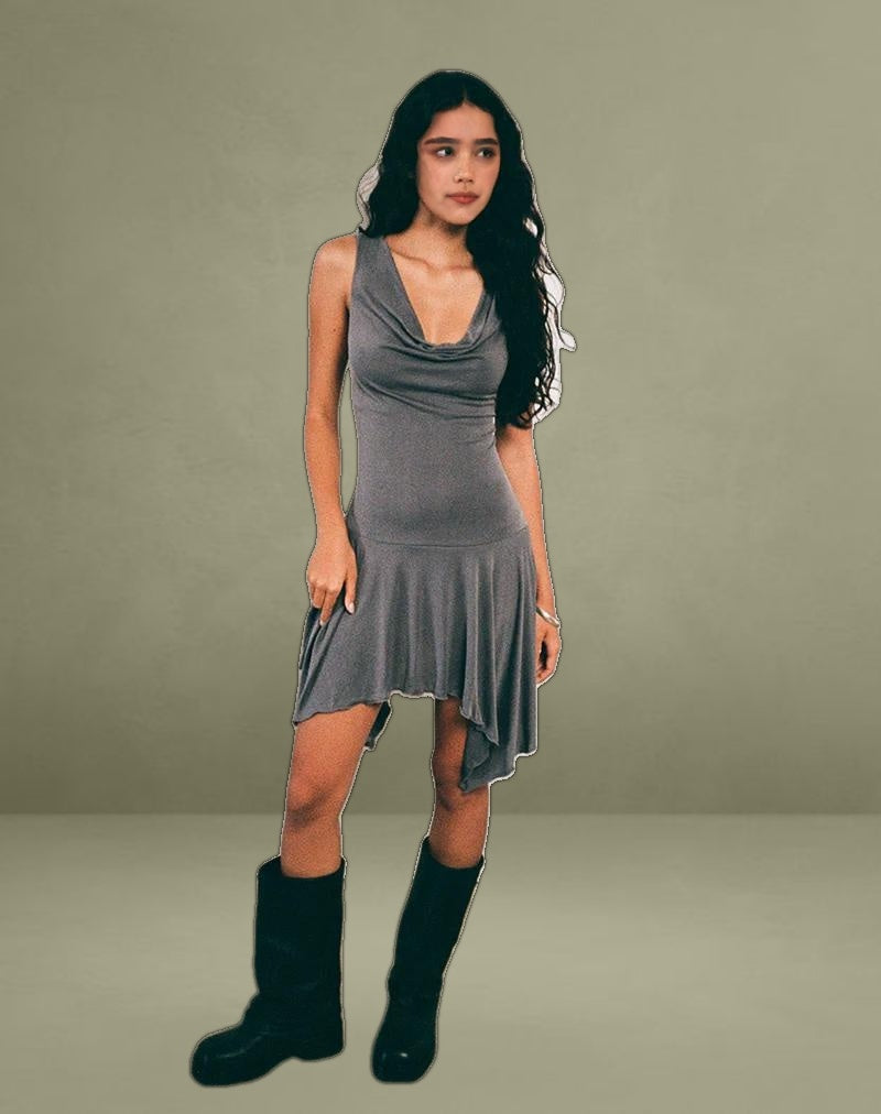 The Briar mini dress in a grey cupro fabric. Featuring a soft cowl neckline, fitted bodice, and dropped waist. Complete with an asymmetric waterfall hemline.