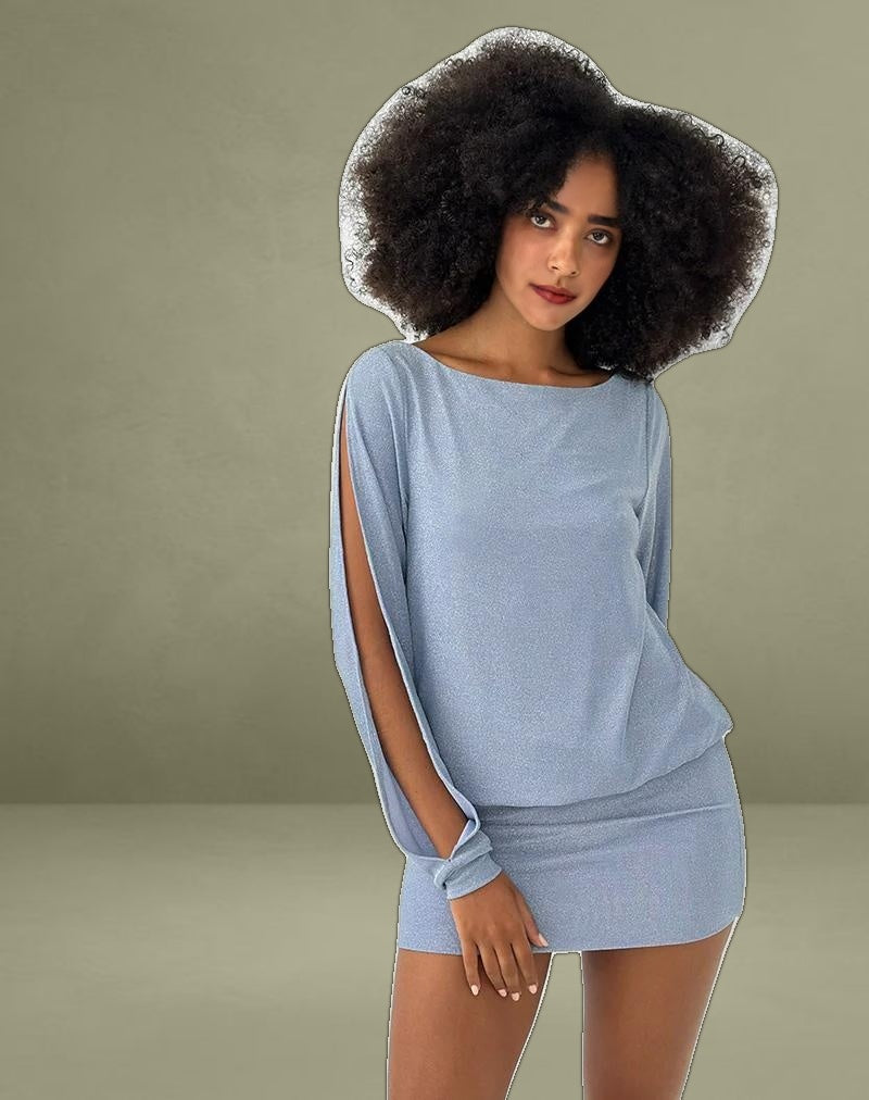 The Carola dress in shimmer blue chain knit fabric, features a boat neckline and long sleeves, detailed with a cut out on each arm and a regular fit that falls mini length.