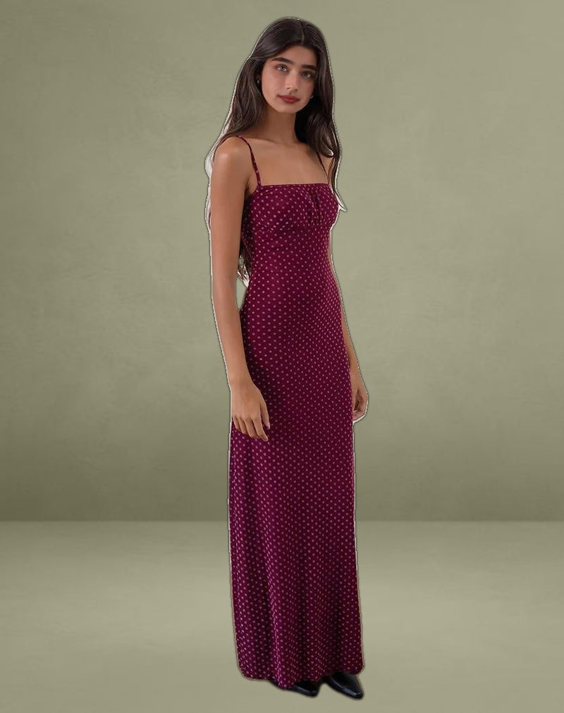 Our best-selling style in a new colourway, the Darsih. A maxi-length dress with cami straps, low square neckline and ruching detail under the bust with a figure-hugging fit, on a flocked berry polka dot base with underlining.