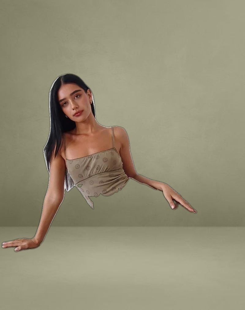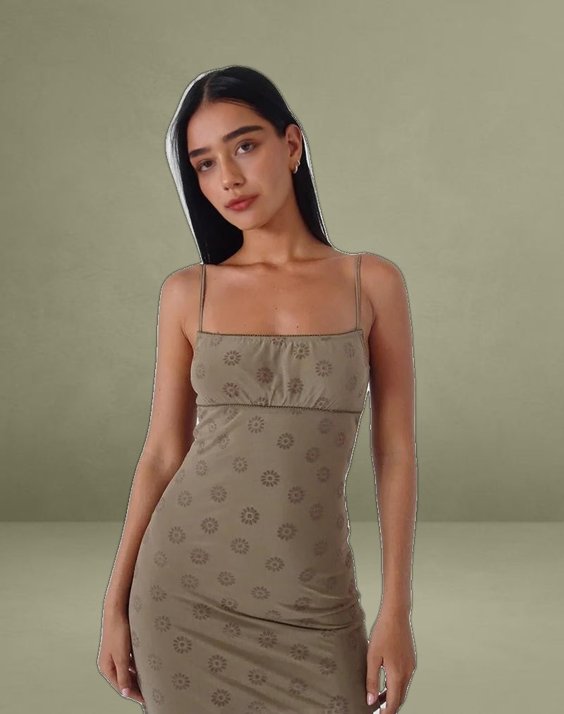 Maxi length dress with cami straps, low square neckline and ruching detail under-bust with a figure hugging fit, in a daily flock mesh print in light brown.