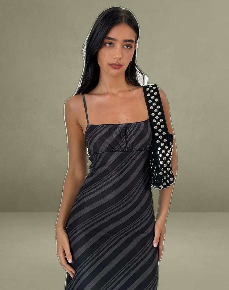 The Darsih dress in a black and grey irregular stripe print on a mesh fabric base. A maxi length style dress with cami straps, low square neckline and ruching detail under bust with a figure hugging fit.
