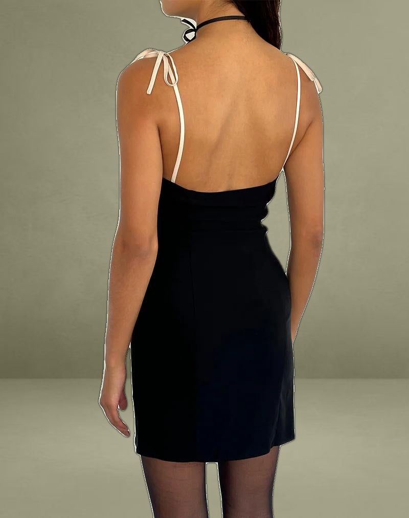 In a black fabric, our Daruka dress features a structured bodycon fit, mini length with a square neckline and adjustable cami straps. Detailed with a cream ruffle trim on the neckline.