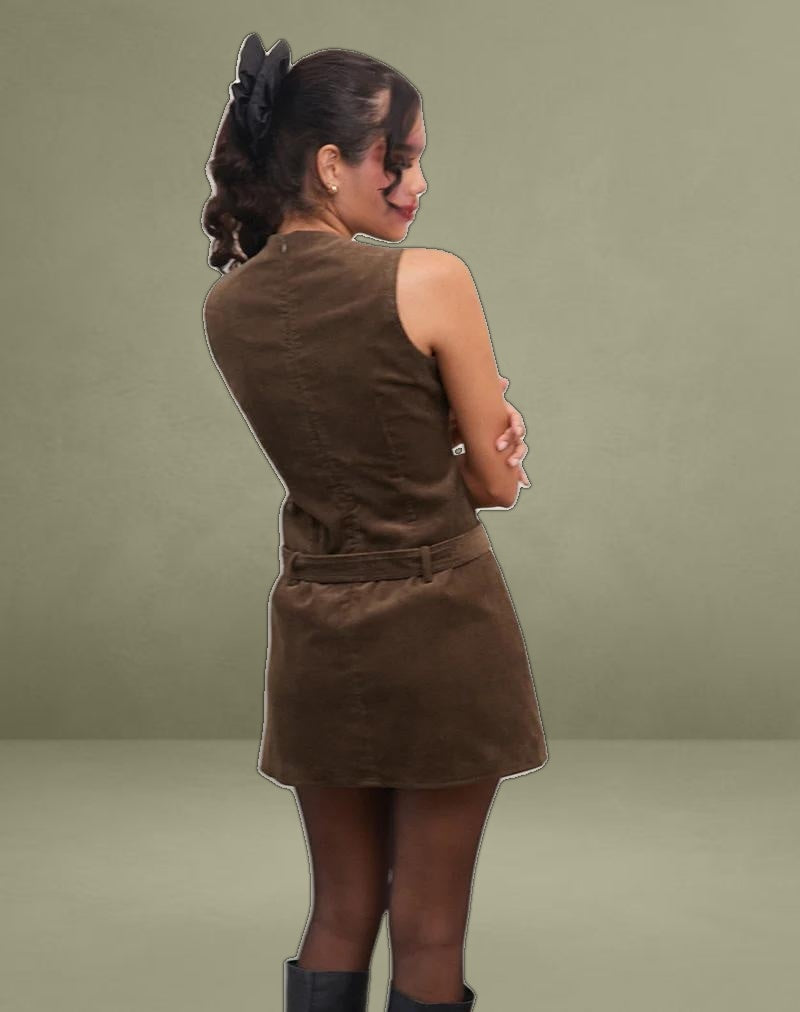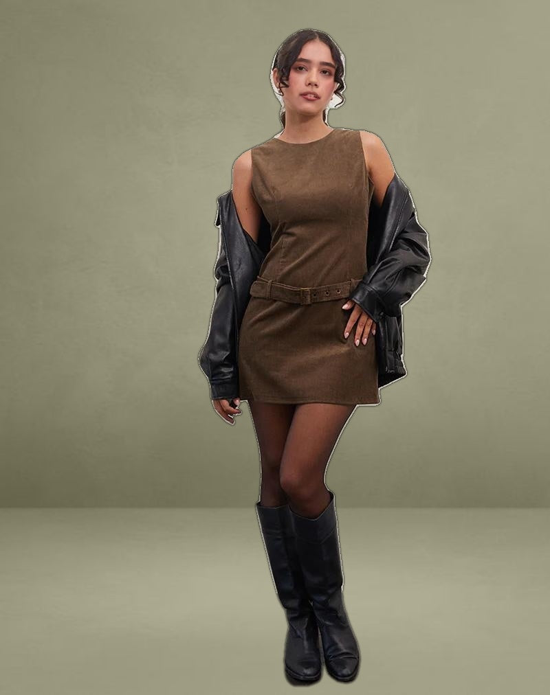 The Dilshan Mini Dress in a brown babycord fabric. Featuring a sleeveless design with boat neckline. Finished with belt detailing.