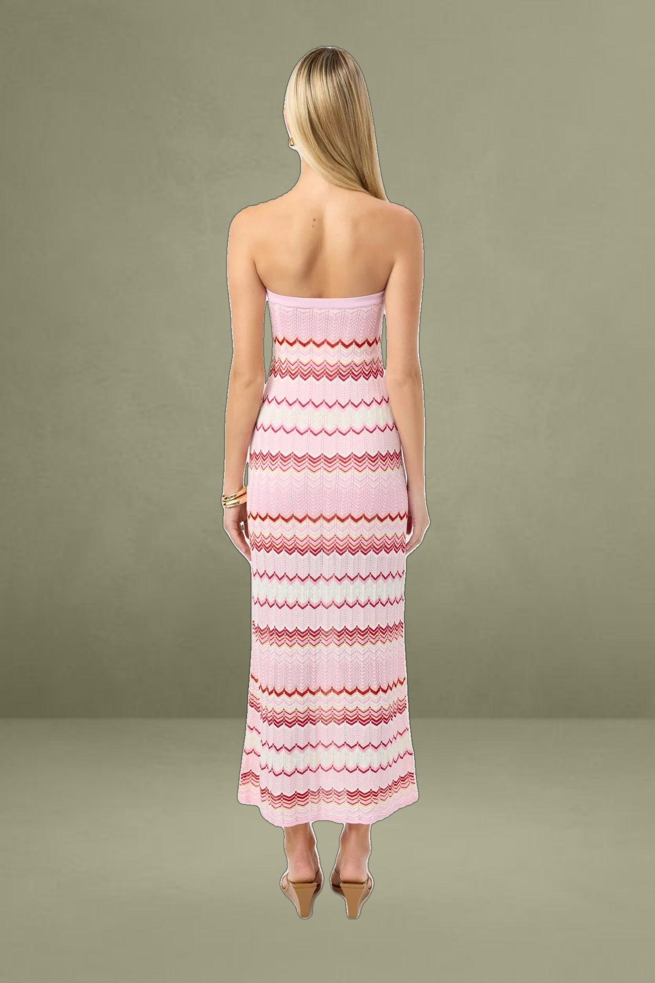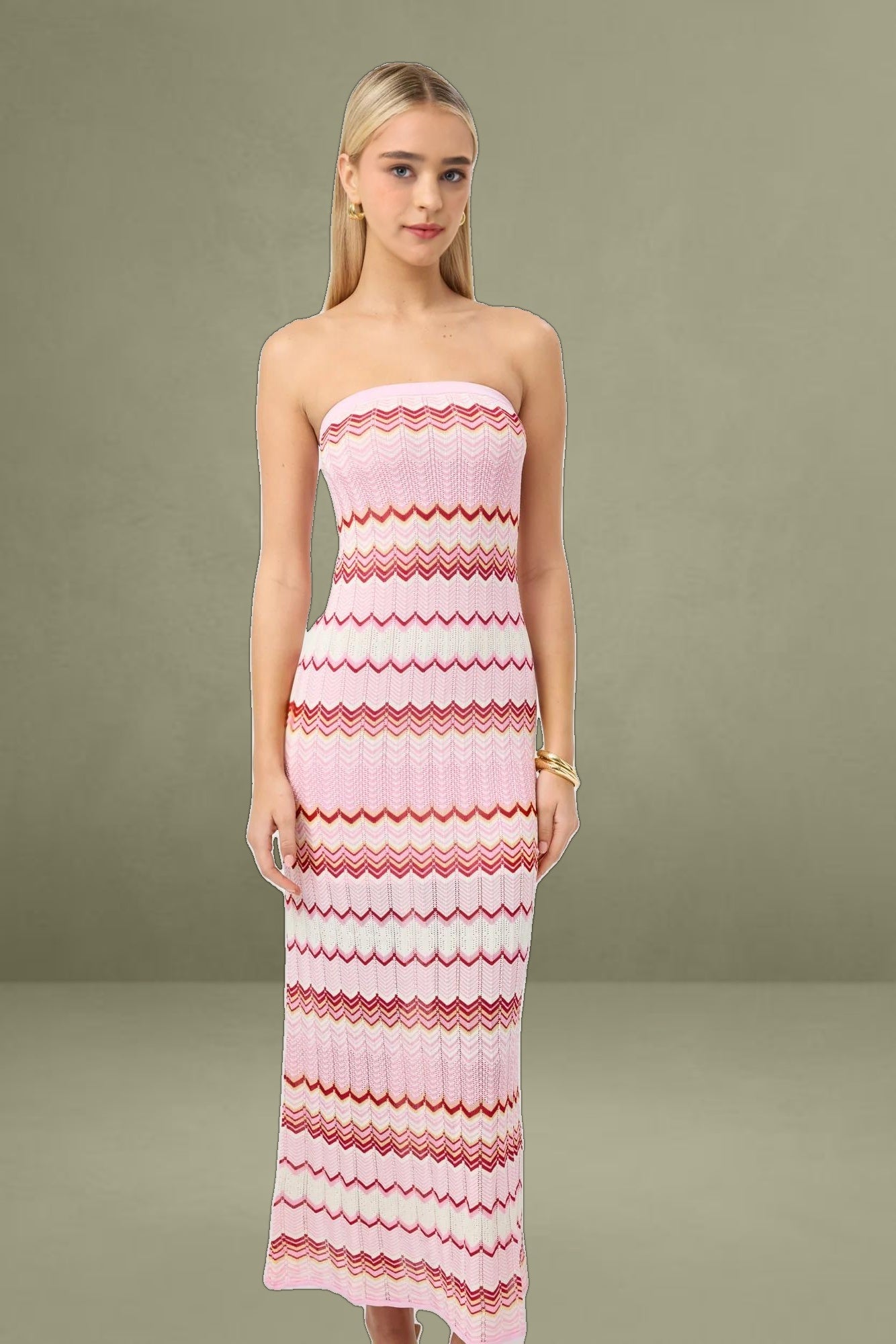 Indulge in effortless elegance with our Edie Maxi Dress in Baby Pink. This stunning knit piece features a blend of blue white hues, creating a unique and eye-catching pattern. The strapless design accentuates your shoulders.