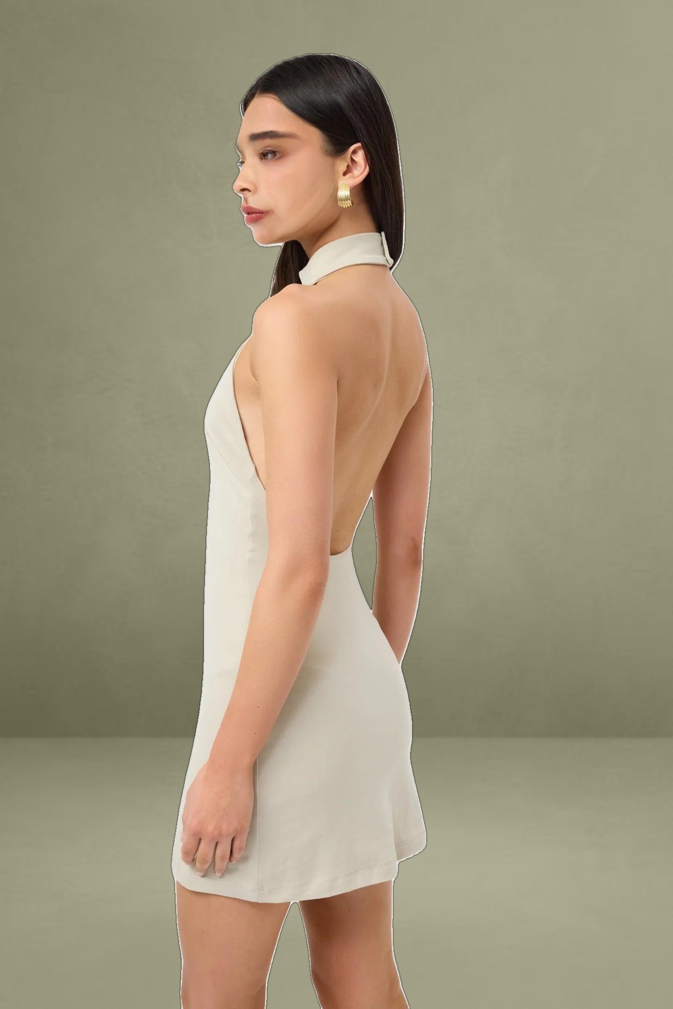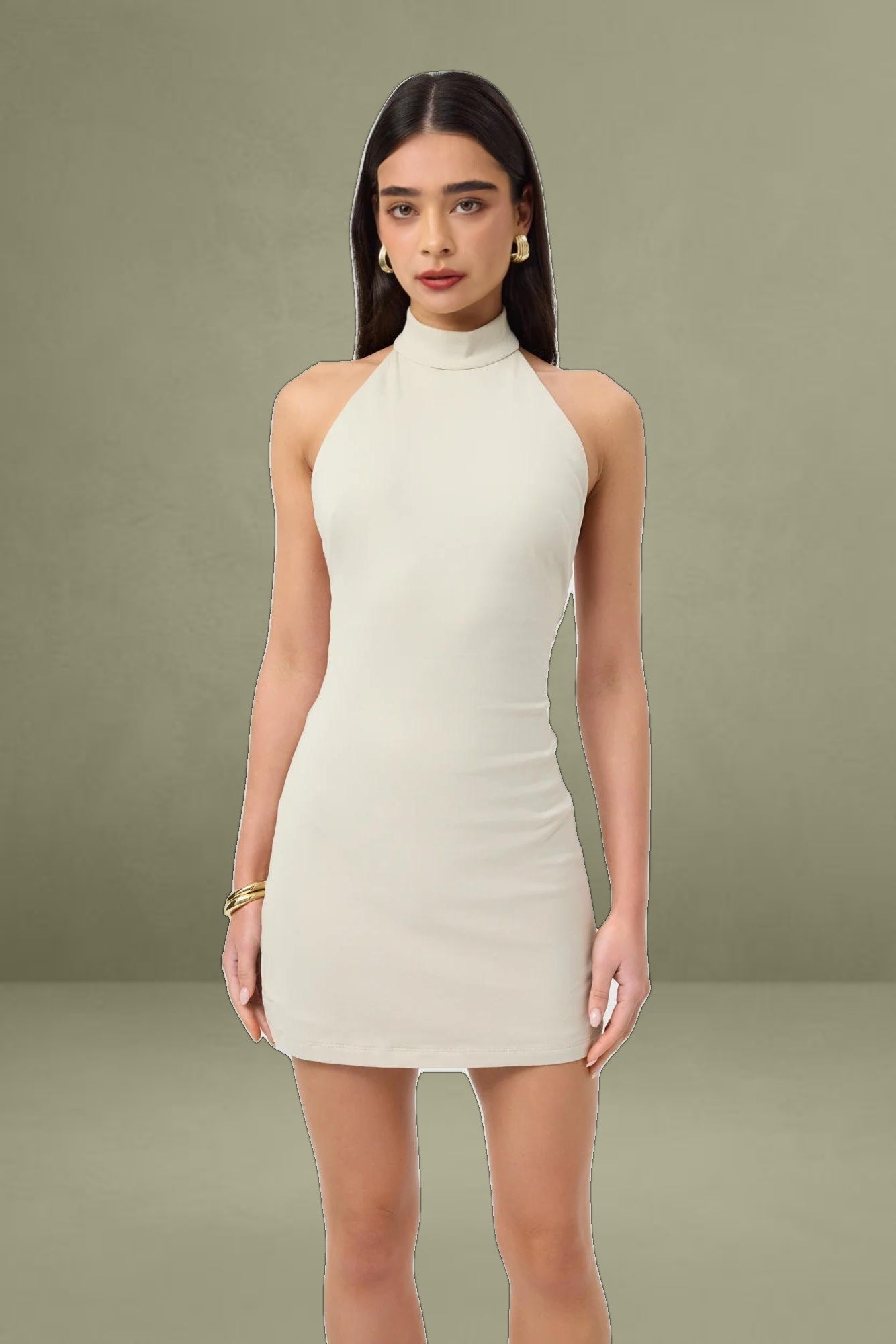 Elevate your dress edit with the Eva Mini Dress. Boasting a fitted halter neckline and backless silhouette, this beige piece is crafted from soft Pima cotton fabrication for optimal comfort and effortless style. Finishing at the mid thigh this mini style is elevated yet classic.