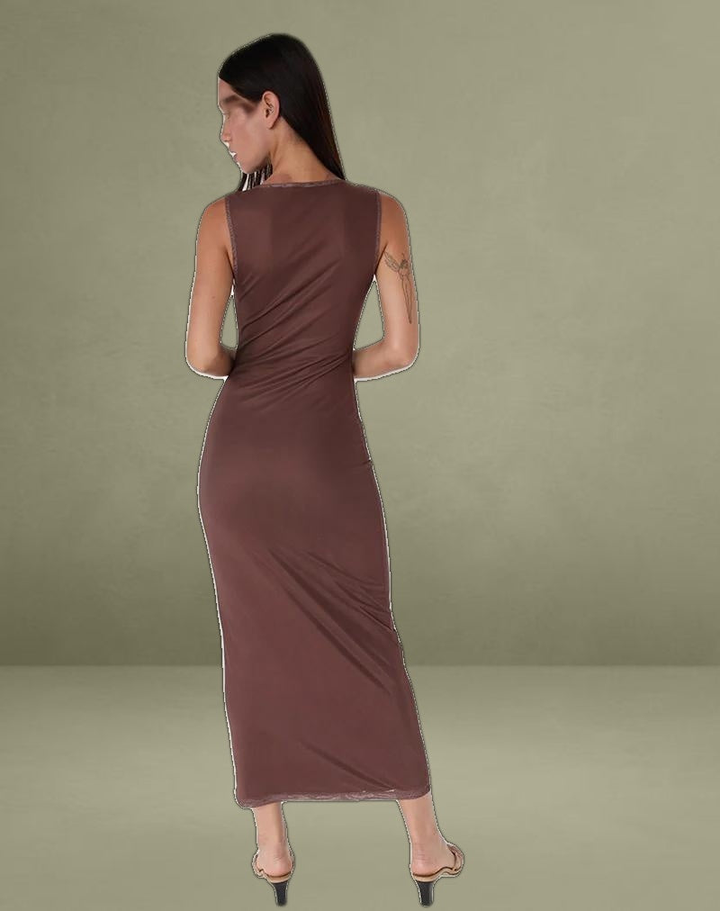 The Fayola maxi dress in brown printed mesh fabric with blurred floral print CF. A maxi dress featuring a crew neck, sleeveless design and solid lining.