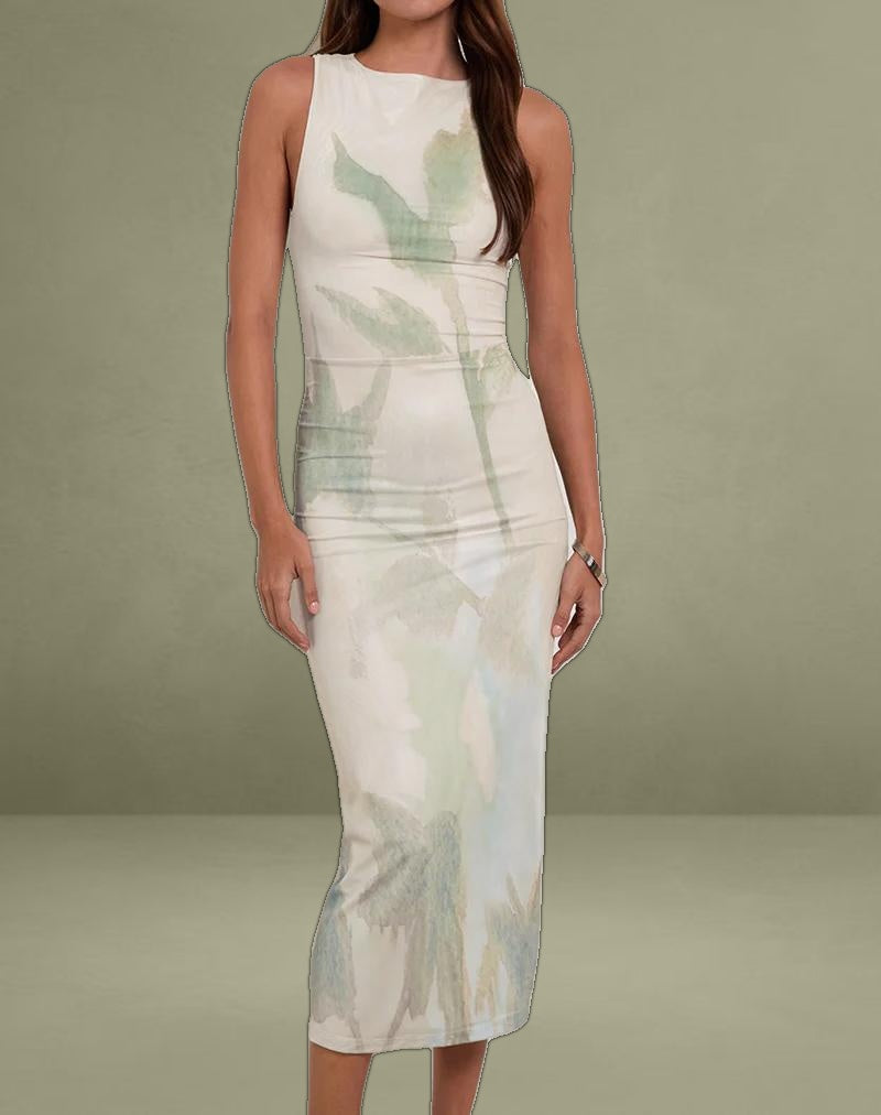 The Flo dress in mesh with an abstract flower painted print. Features a crew neck, sleeveless design and a midi length fit.