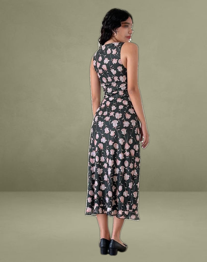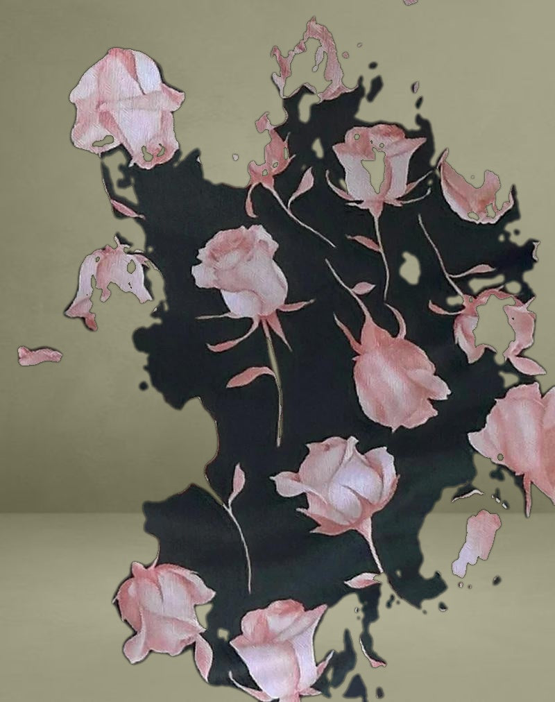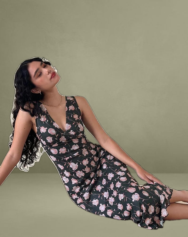 Our bestselling Gabriela dress now comes in a jet black falling rose print. Featuring a slim fit that falls midi length with a plunge v neckline and thick straps. Detailed with a lettuce hem in a lined mesh fabric.