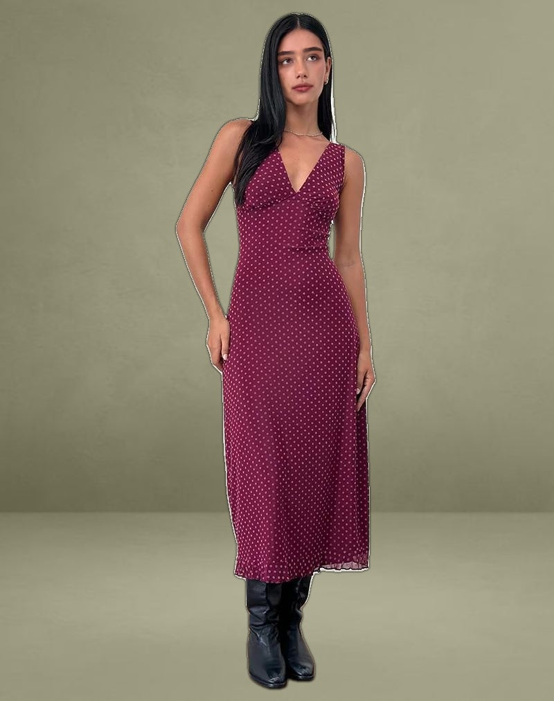 Our bestselling Gabriela dress has a new colourway, in a basic flocked polka dot in berry. It features a slim fit that falls midi length, a plunge V neckline and thick straps. Detailed with a lettuce hem.