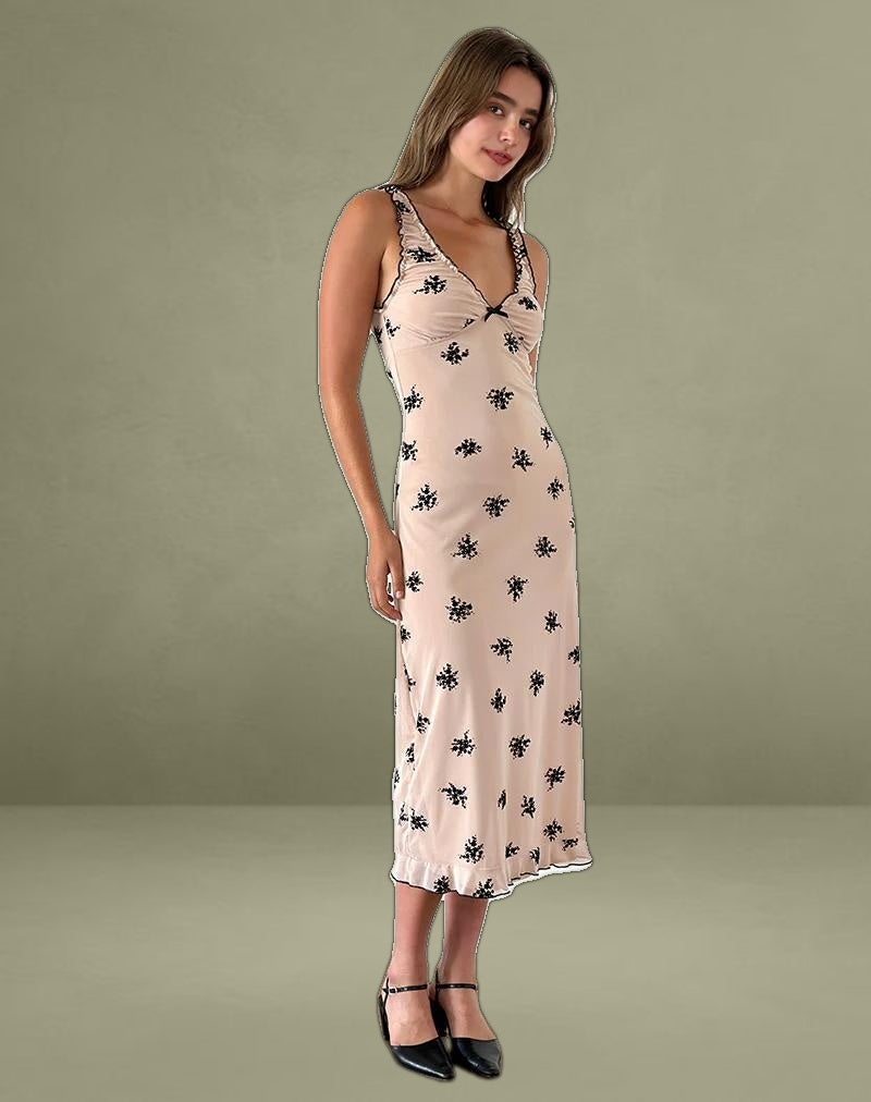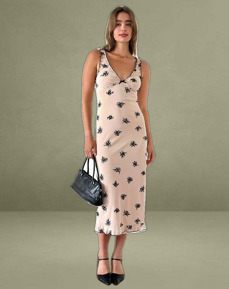 The Gandira midi dress in a nude and black cluster ditsy floral print features thick straps, a low v neckline and lettuce hem.