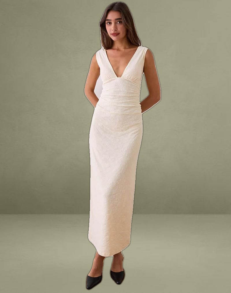 Gerda dress in cream floral flock print on a flocked mesh fabric base. Maxi style dress with plunge neckline and sleeveless fit. Finished with a lettuce edge on the hem. Dress is fully lined.