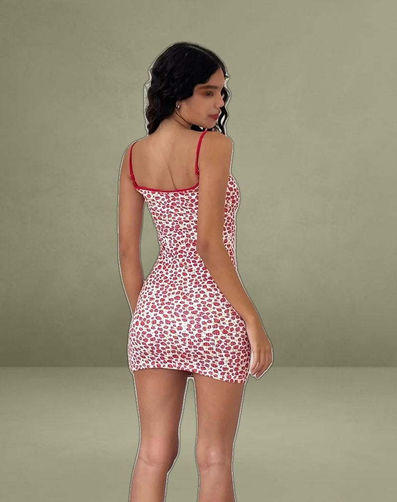 Every spring wardrobe needs the Gracias dress. Featuring a bodycon mini fit, scoop neckline and thin straps, in a thick rib strawberry 2023 print fabric.