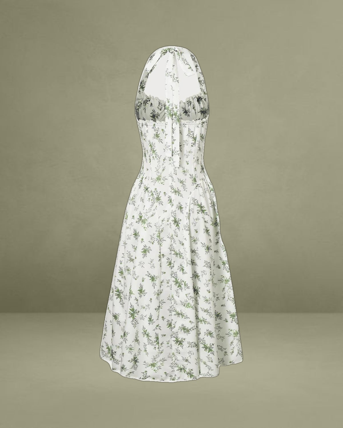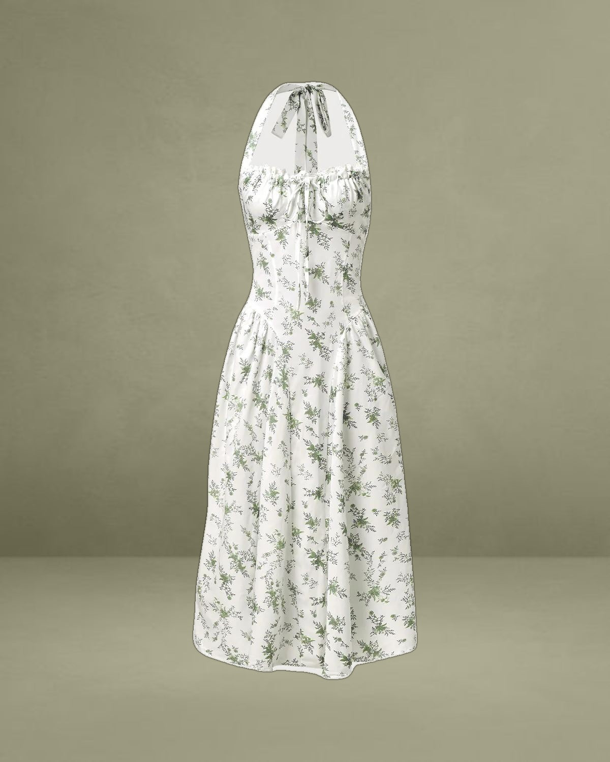 With a halter neckline and flattering ruching, this floral midi dress exudes effortless charm—a versatile pick for warm-weather gatherings or romantic evenings.