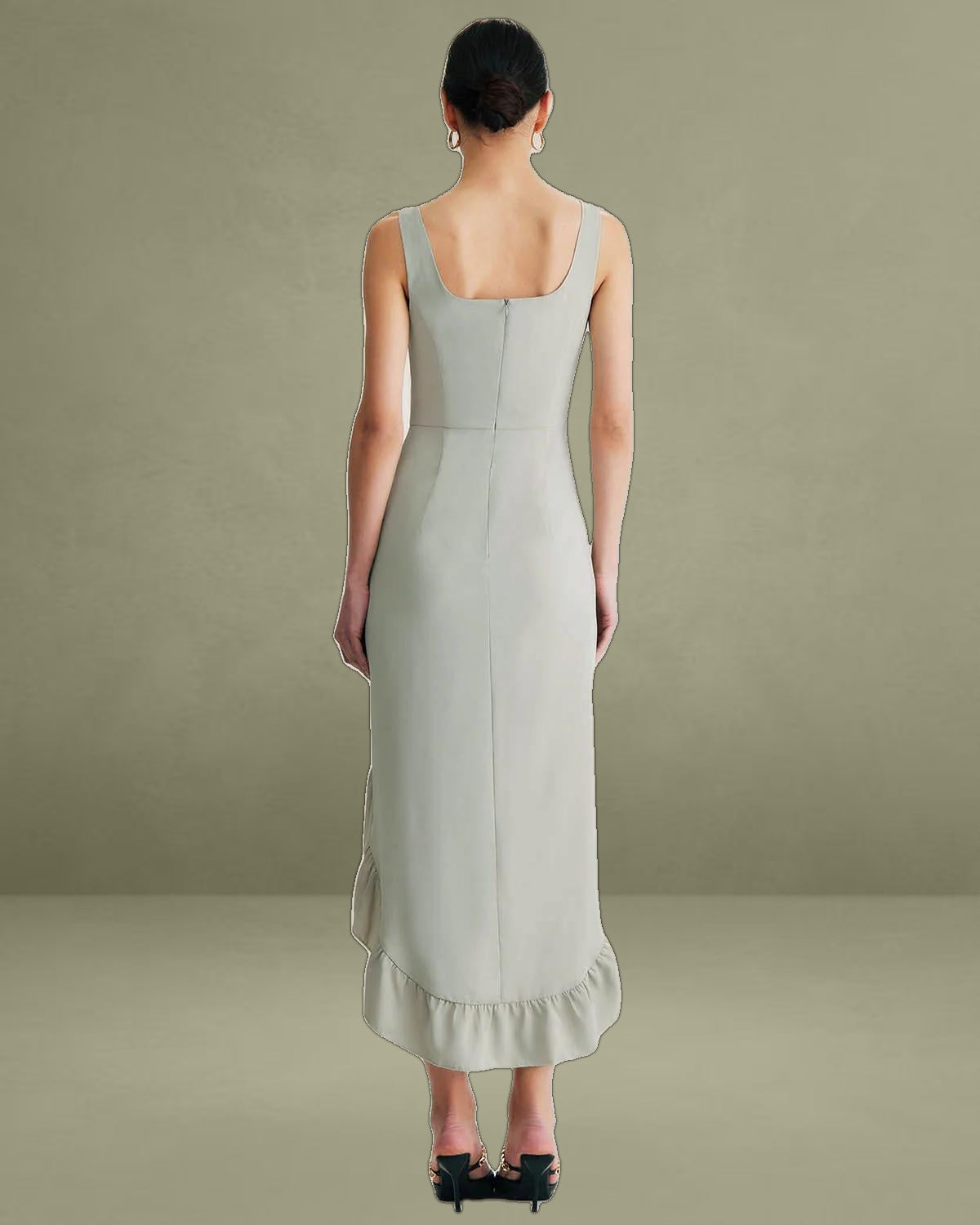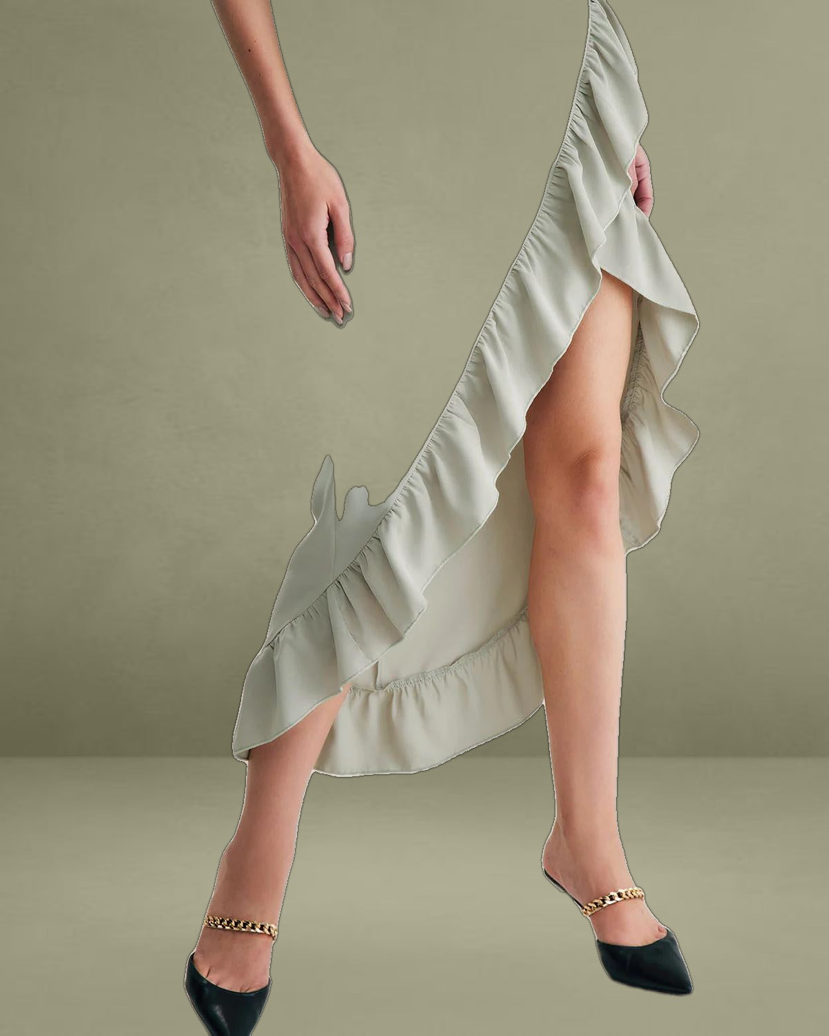 This elegant piece features a soft, silky fabric with a graceful slip silhouette, a thigh-high slit for added allure, and playful ruffle detailing along the hemline. The adjustable spaghetti straps and V-neckline create a flattering fit, while the vibrant green hue adds a fresh pop of color.