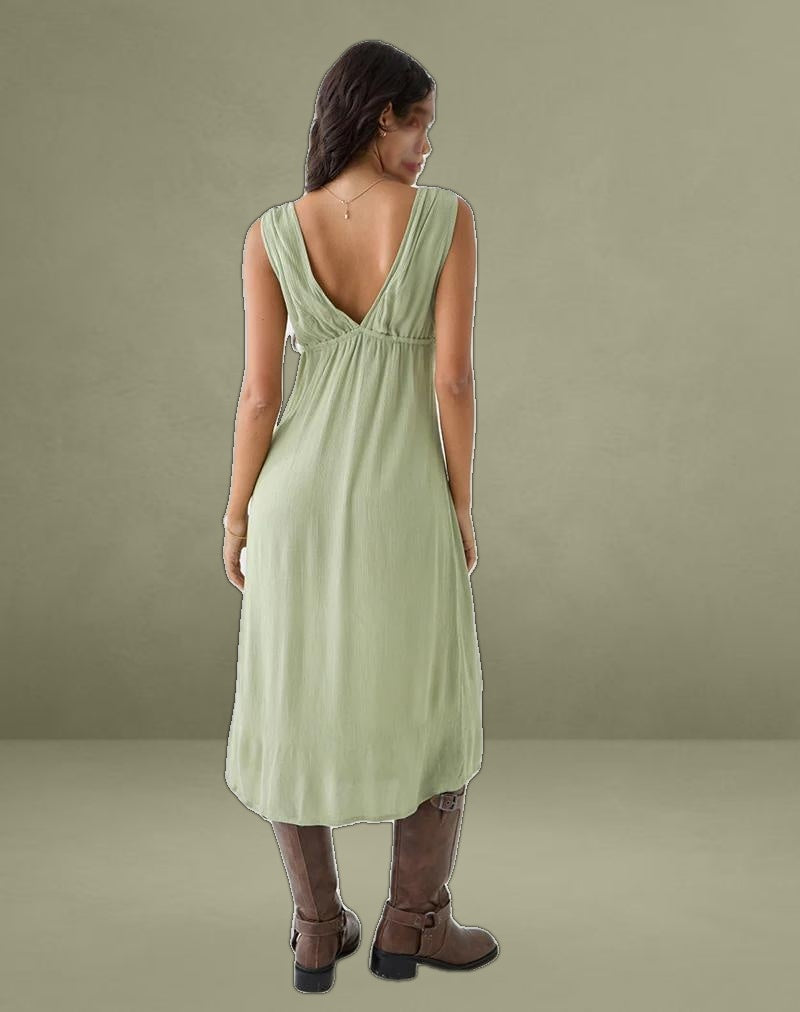 The Havisla dress in sage green, features a plunge neckline, sleeveless design with a regular fit that falls midi length. Complete with the tie front detail.