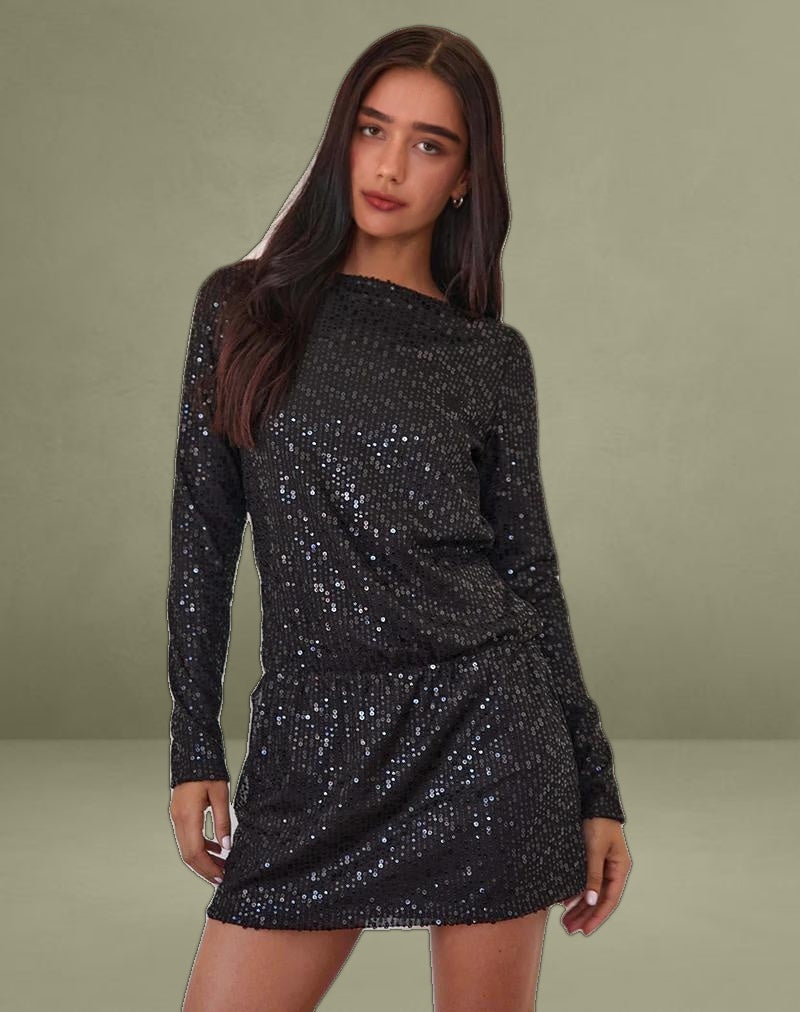 The Jasilia dress in a black gauze sequin fabric, features long sleeves, boat neckline and mini length fit with elasticated waist seam. Complete with key hole cut out back detailing.
