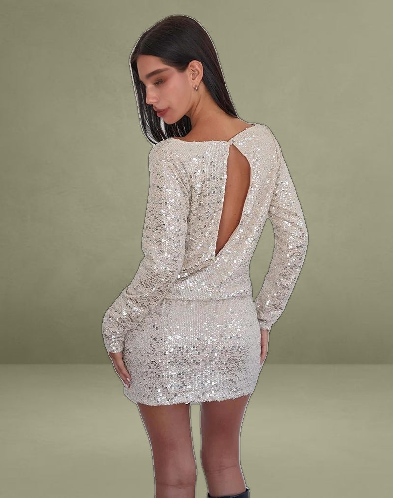 The Jasilia dress in a neutral sequin fabric, features long sleeves and a mini length fit with elasticated waist, boat neckline and key hole cut out detailing at the back.