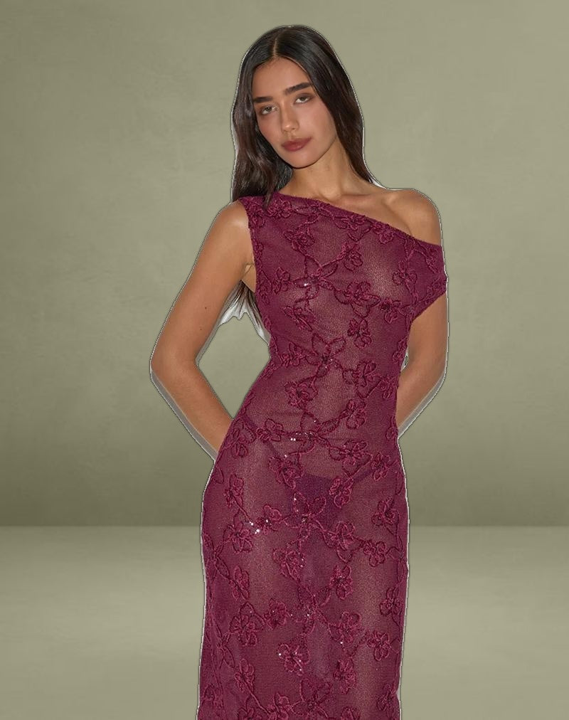 The Kaido dress in a luxurious burgundy sequin knit fabric. Featuring a flared, midi fit with thick straps and a bardot one-shoulder strap design. This dress is unlined.