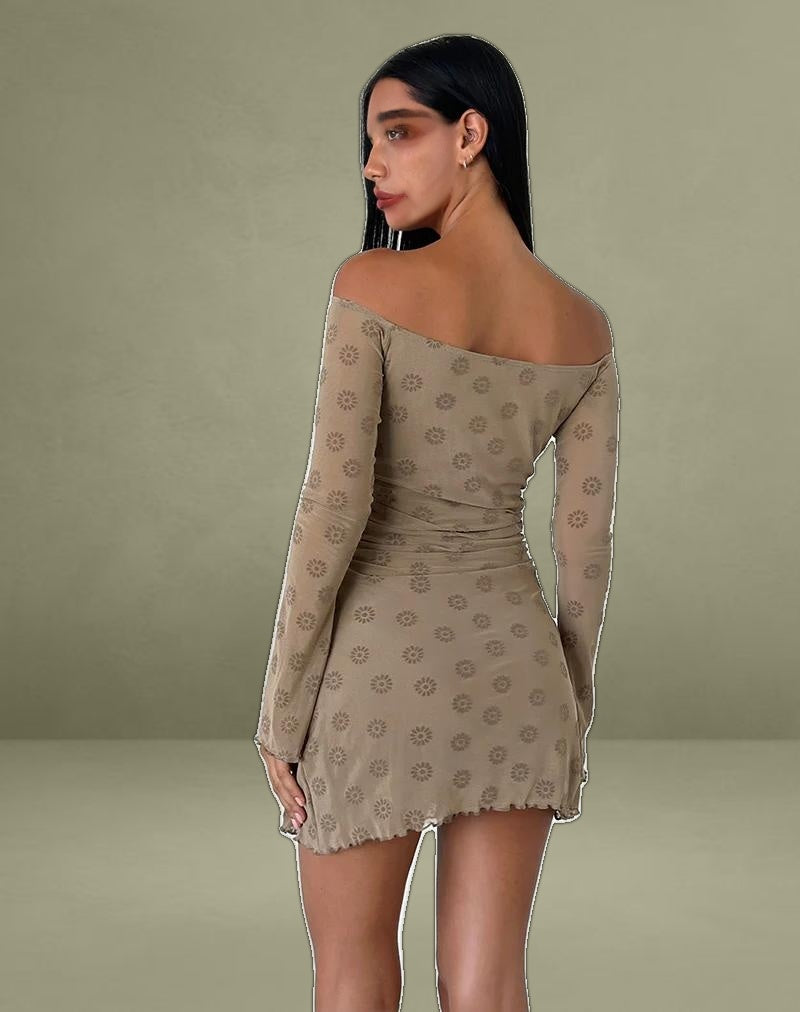 The Kausar dress, features an off shoulder design with bardot fit, long flared sleeves and mini length, finished with ruching detail along the waist and aline flowy skirt with lettuce hem, on a light tan mesh base with an all over floral in tonal flock.