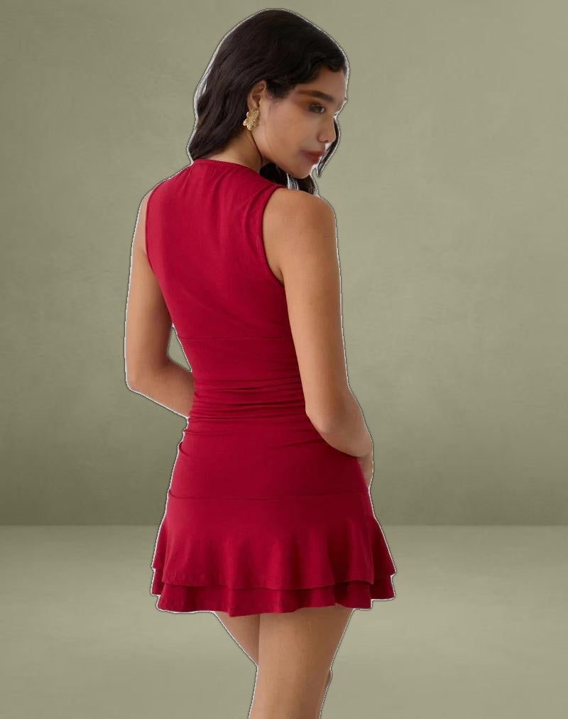 The Lanai mini dress in a rayon jersey adrenaline red fabric. Featuring a plunge v-neckline with thick straps, under bust lining and a two tired hemline. Complete with a ruched effect established from the slinky material.