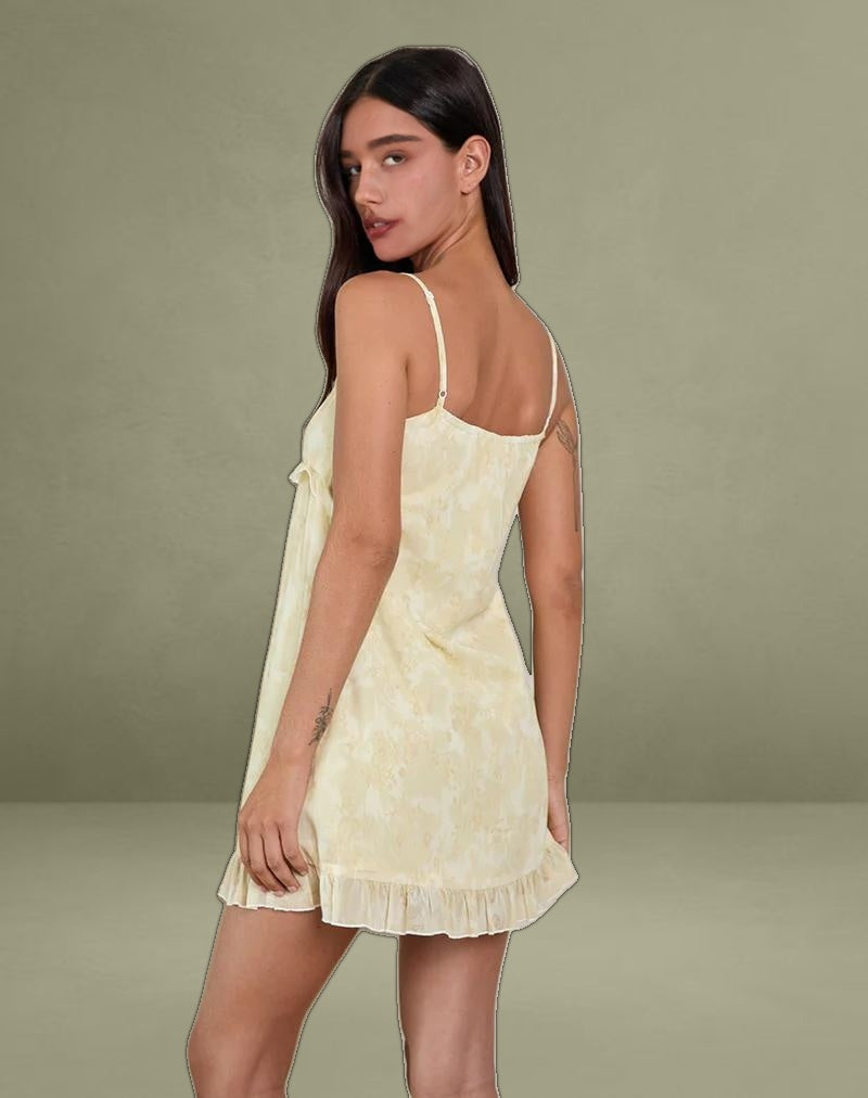 The Liuka dress in a yellow coloured chiffon with a smudge floral print. Features a square neckline with thin cami straps and a loose fit which falls mini length. Finished with a frill trim underbust and hem.
