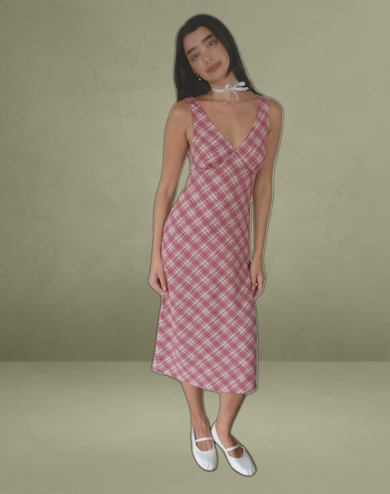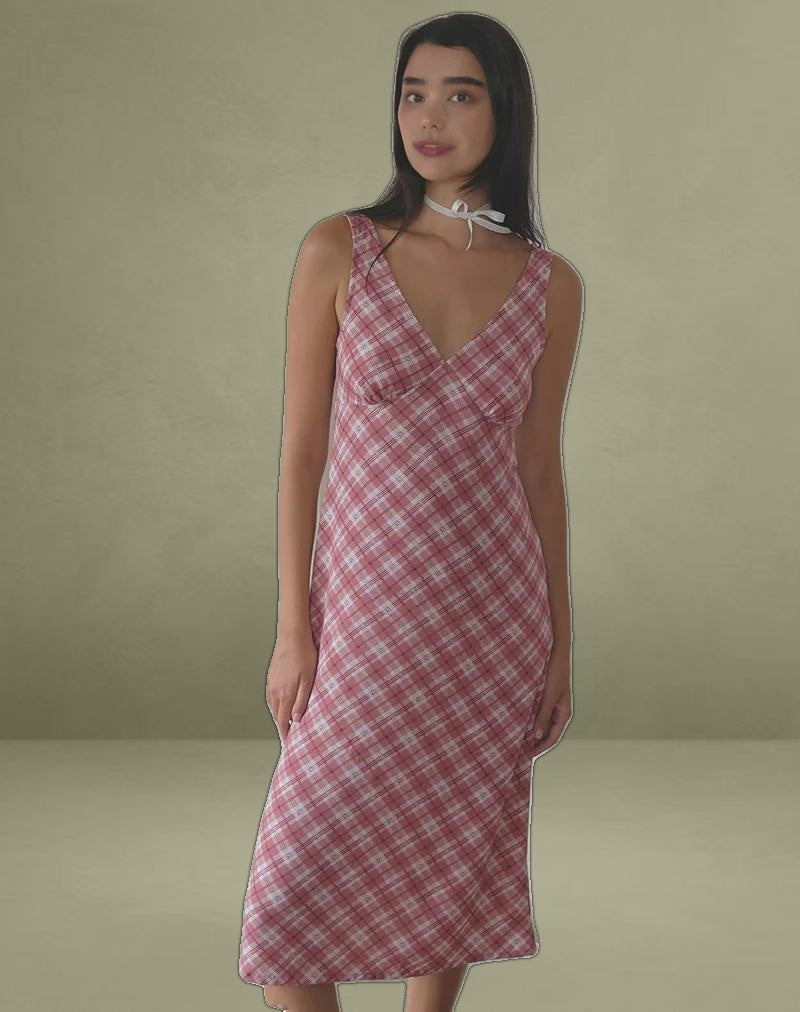The Liva dress in a pink tartan fabric, featuring a loose fit that falls midi length with a plunge v neckline and thick straps.