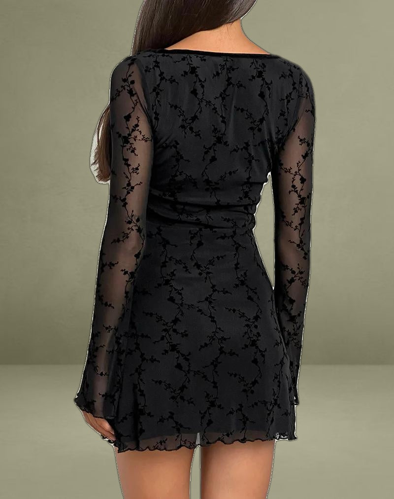 In a black vine flower printed mesh, the Luth dress features a bodycon fit with a mini length hem, long fluted sleeves and a square neckline with ruched detailing. Complete with a lettuce hem.