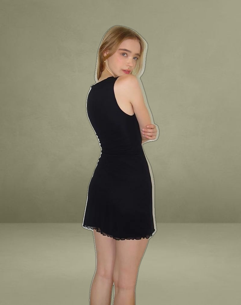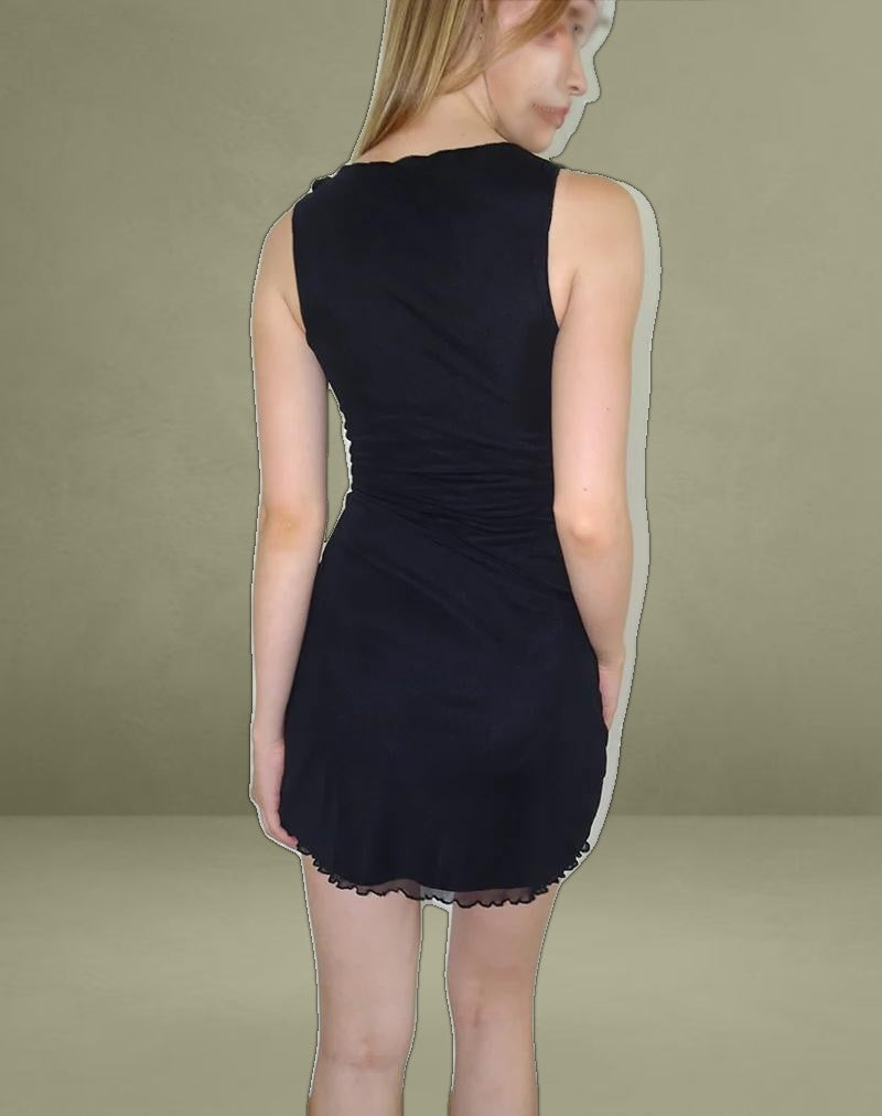 The Masita mini dress comes in a mesh black fabric with asymmetric underlining. Complete with a cut out detail on the one shoulder and lettuce hem.