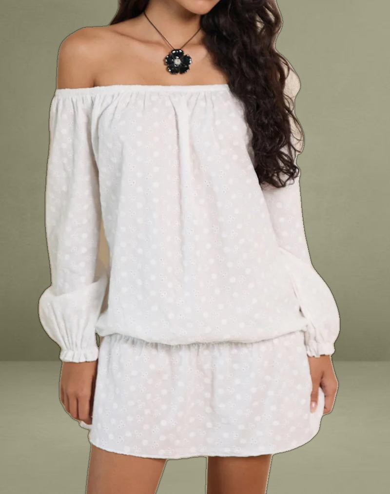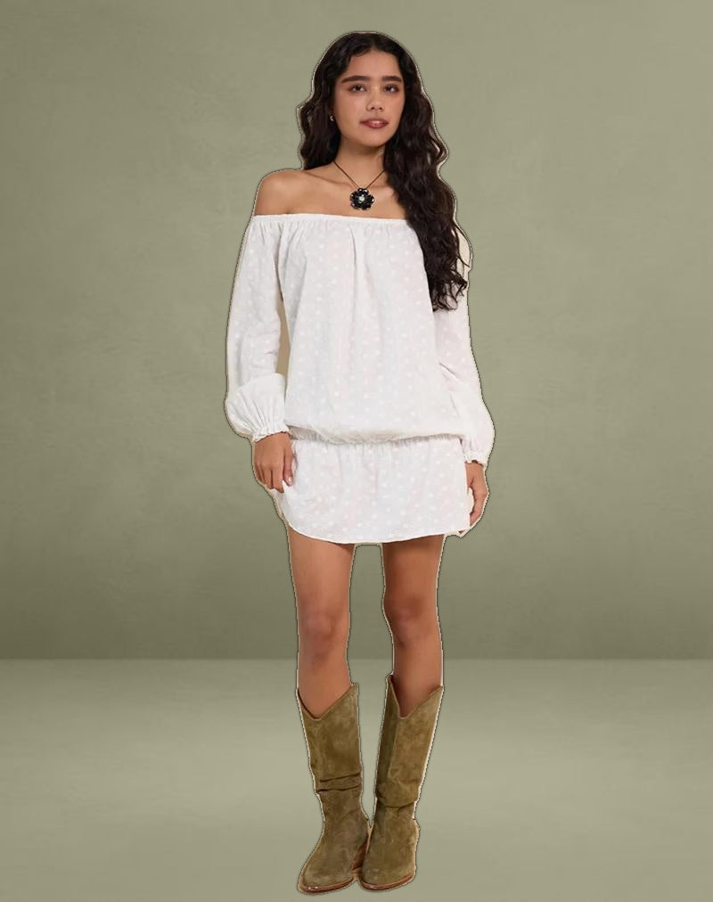 The Melisandre dress in ivory broderie fabric. Complete in a mini length style with a bardot neckline, long sleeves with an elasticated cuff detail. Finished with an elasticated dropped waist with frill detail.