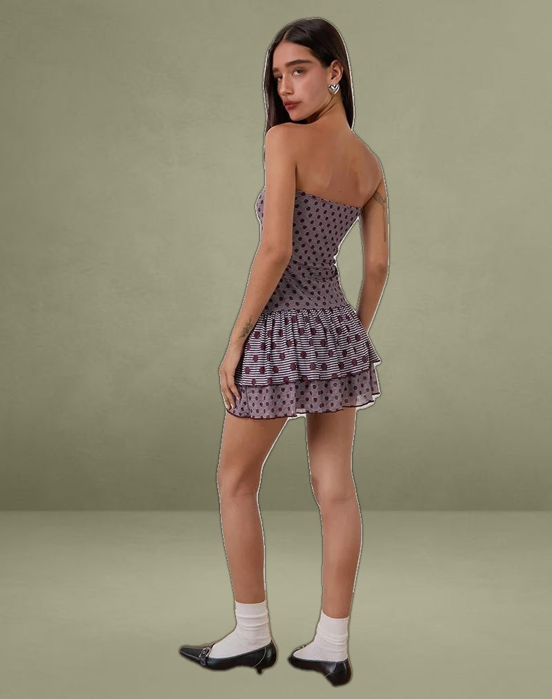 Midea dress in plum polka dot stripes. Bandeau style mini dress with frill skirt hem detailing.