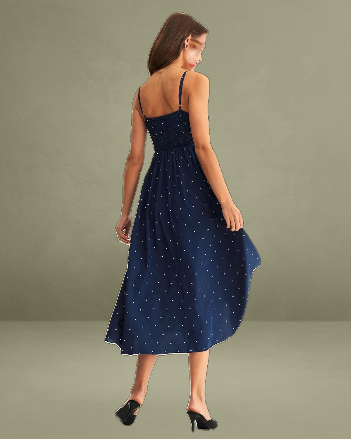 Featuring a flattering shirred bodice and a timeless navy blue base with white polka dots, this dress hugs the figure in all the right places. The slip-style design offers a relaxed, comfortable fit, while the midi length adds a touch of sophistication.