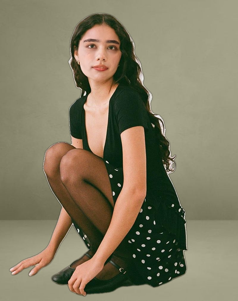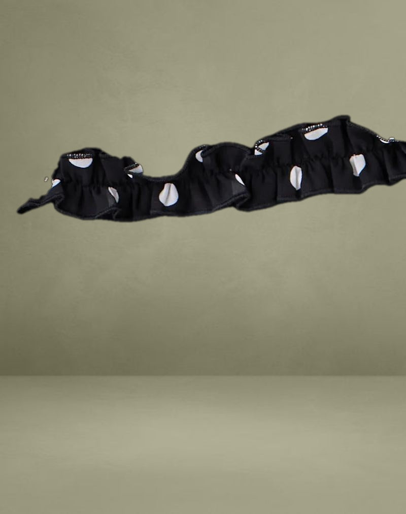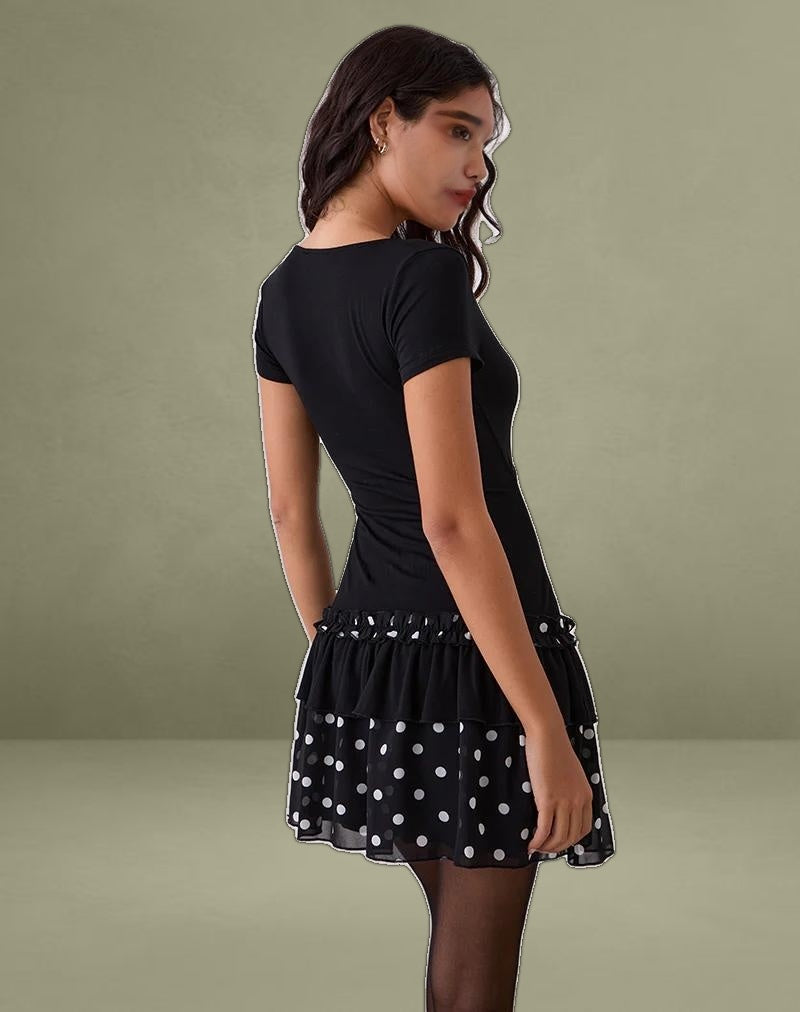 The Navya mini dress in polka black and white in a soft jersey fabric. It features a wrap-style v-neckline, short sleeves and a fitted bodice. The skirt showcases a chiffon tiered ruffle hem.