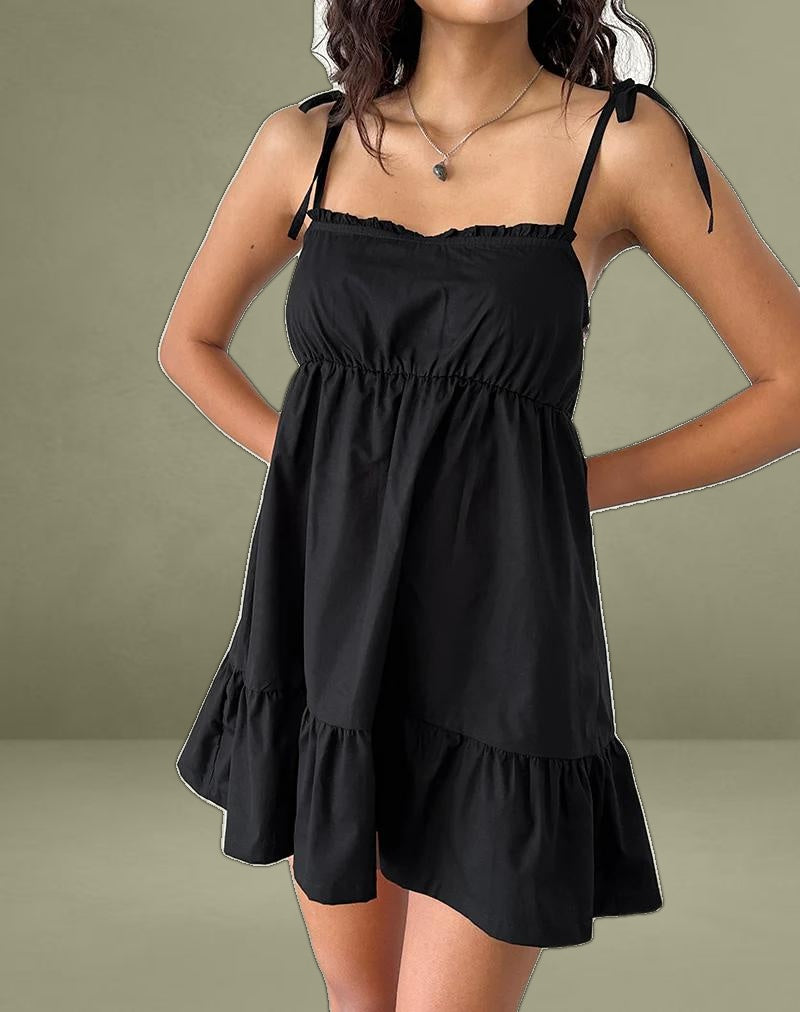 The Nigta dress in black poplin fabric. It features a mini length fit, straight neckline with a chunky cotton tie detail and bow CF.